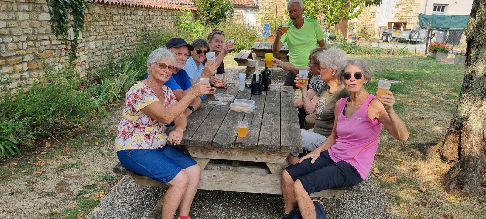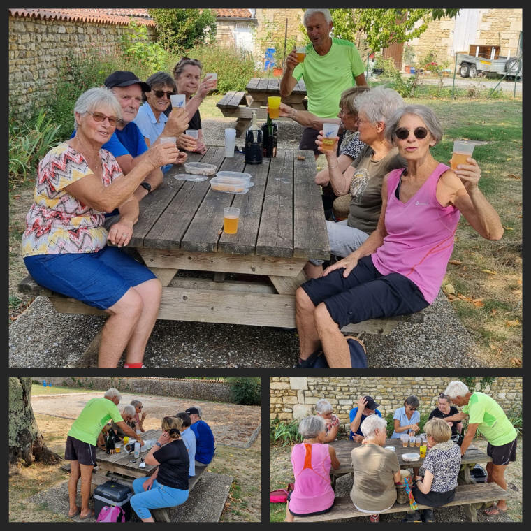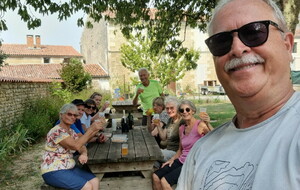 Après avoir rebroussé 2 chemins dans le bois de la Fiolle, une ultime pose boisson au Moulin de Rioux. En abordant la rue St André, nous passons devant le Domaine de Beaupréau, la belle église Notre Dame de Rioux et les Halles de Rioux qui remontent probablement au XVe siècle.