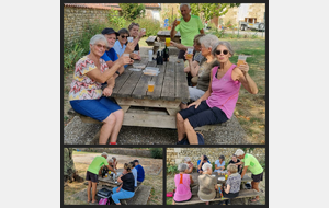 Dans le jardin de la mairie et à la façon d'une aventure d'Astérix et d'Obélix, tout se termine dans la joie et la bonne humeur autour de la table de Laurence et Yvan qui nous offrent rosé, cidre breton, crackers, mini saucissons et bâtonnets de bretzels.