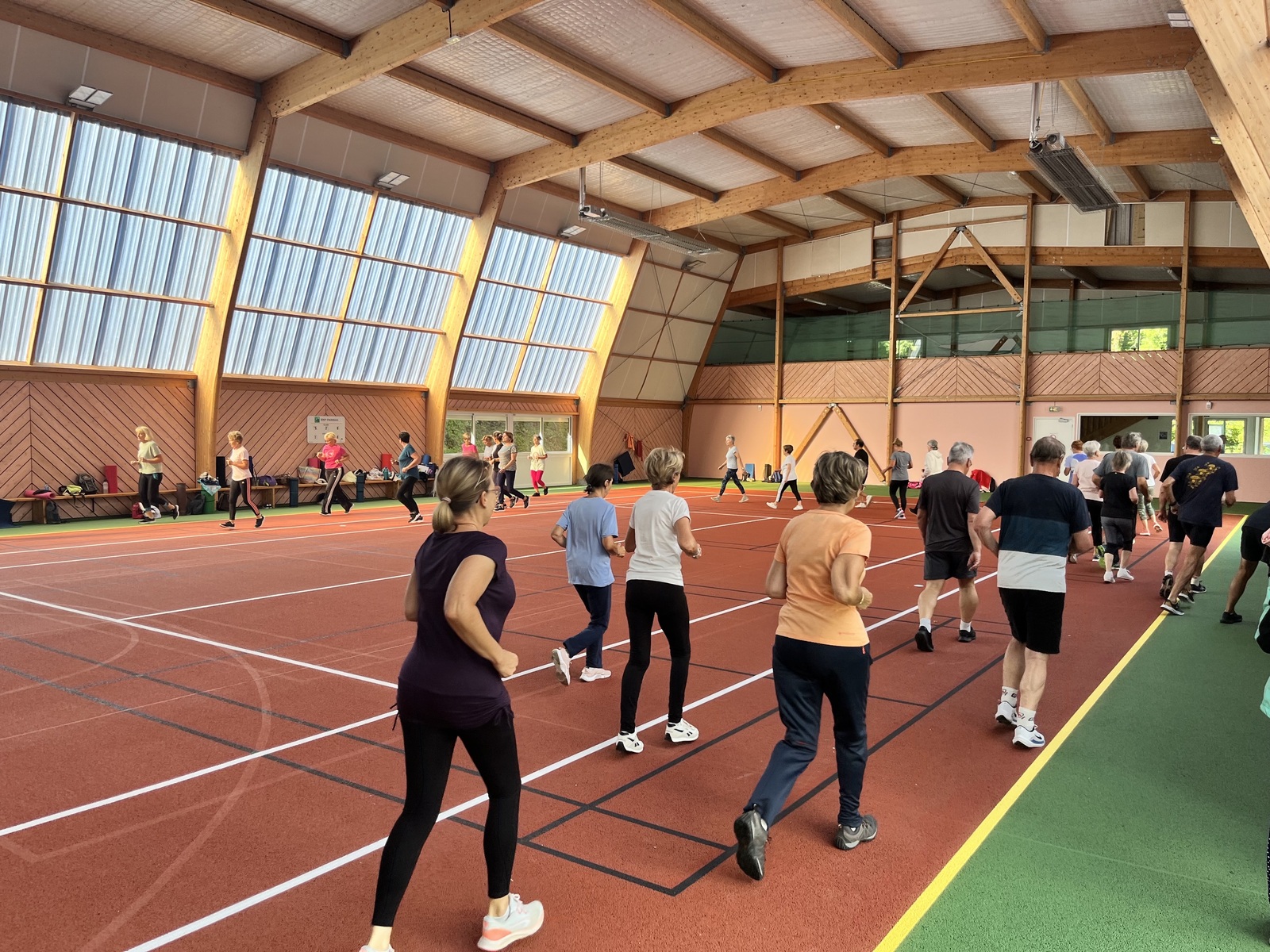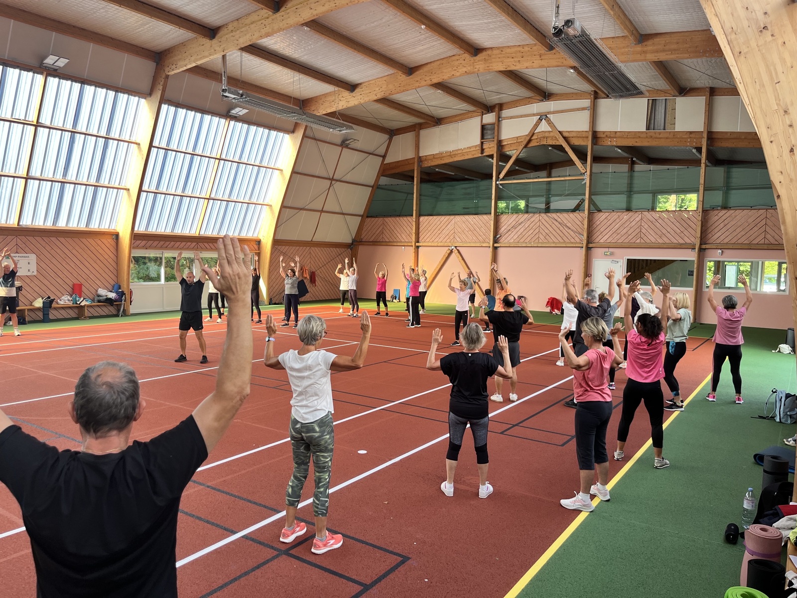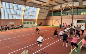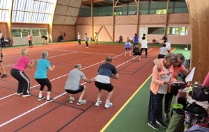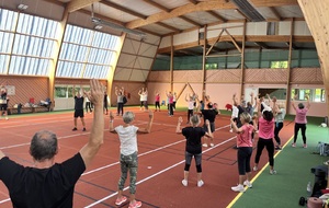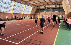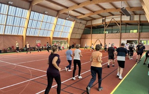 Photos prises lors de la phase des échauffements du cours de Pierrick.Les adhérents profitent du nouveau revêtement de la salle multisports qui vient d'être refait.