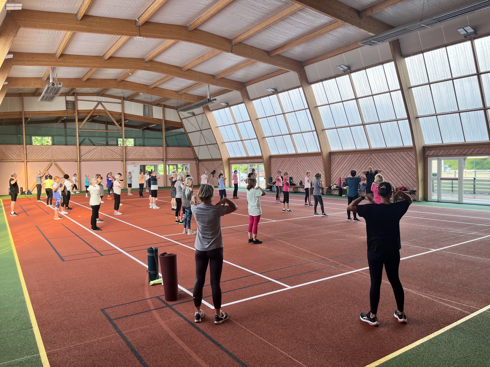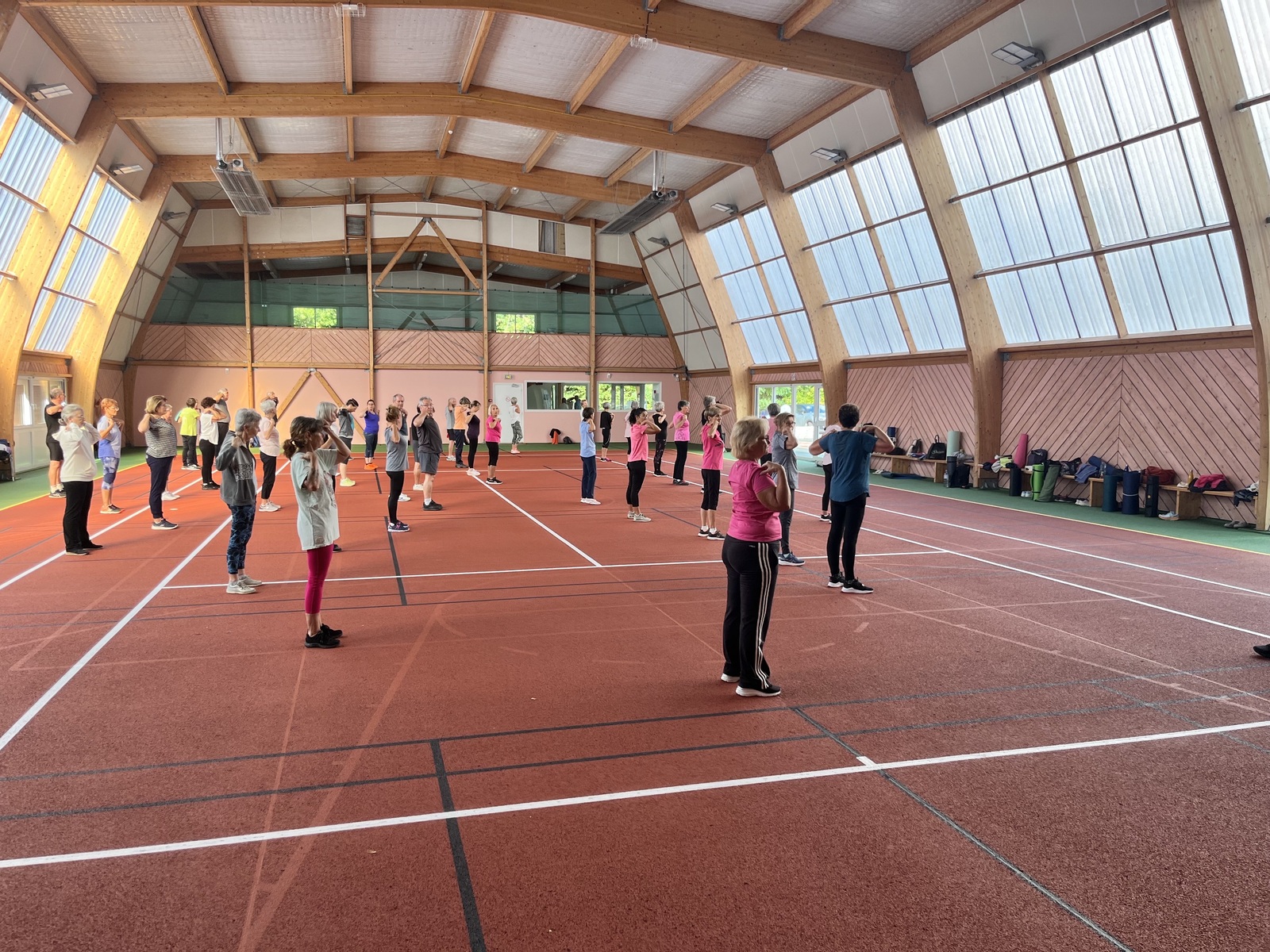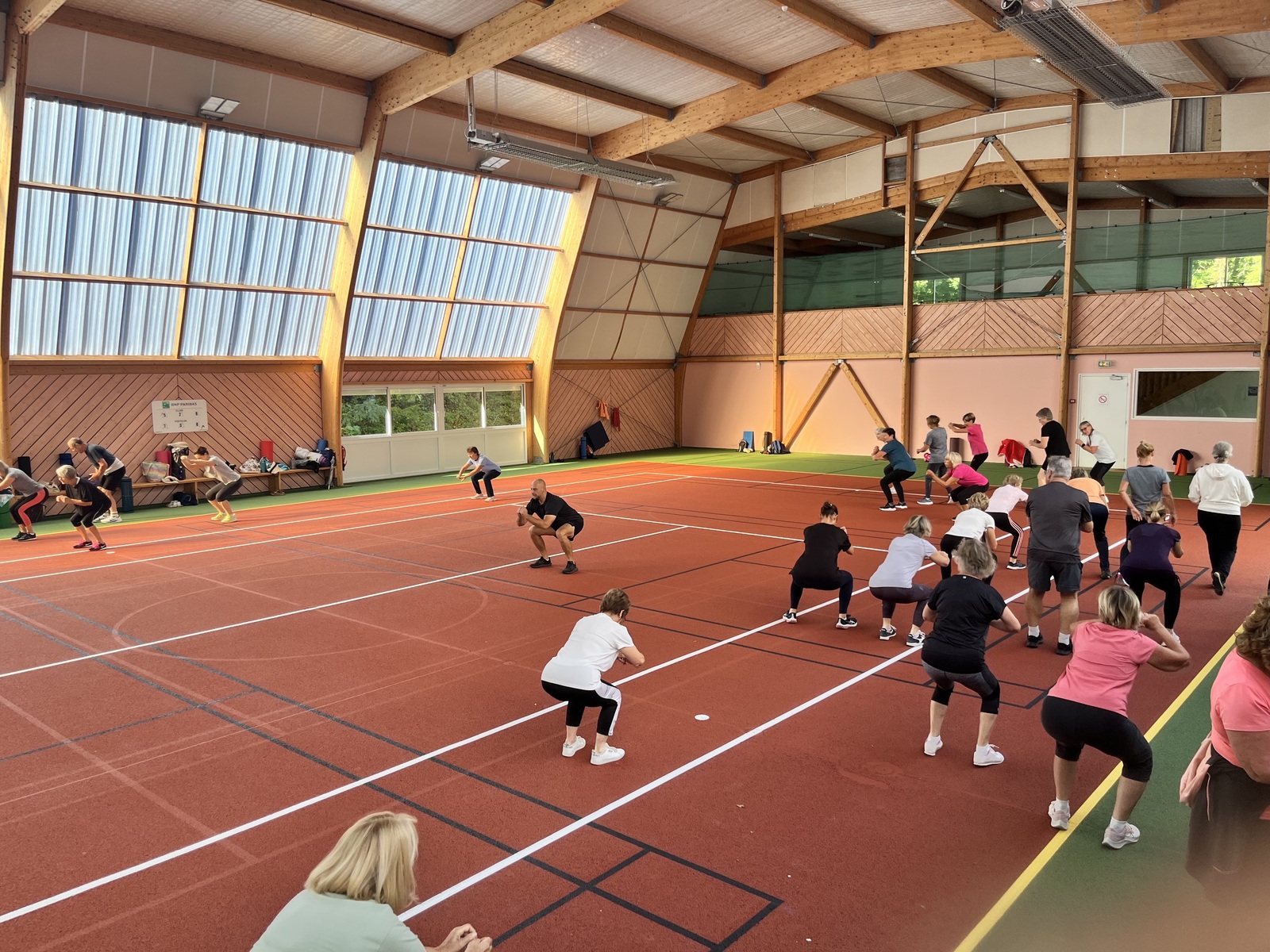 Photos prises lors de la phase des échauffements du cours de Pierrick.Les adhérents profitent du nouveau revêtement de la salle multisports qui vient d'être refait.