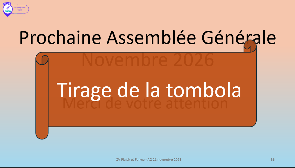 Pour les adhérents connectés sur notre site Internet ou utilisateur de l'application mobile SportsRegions, il existe un album avec plus de photos "21/11/2025 - Assemblée Générale GV Plaisir et Forme - l'intégrale" pour mieux faire connaissance ou reconnaître les participants à cette AG.