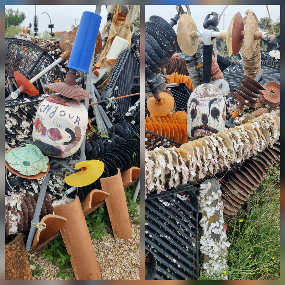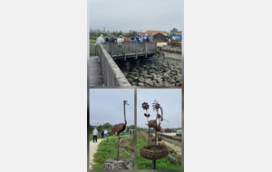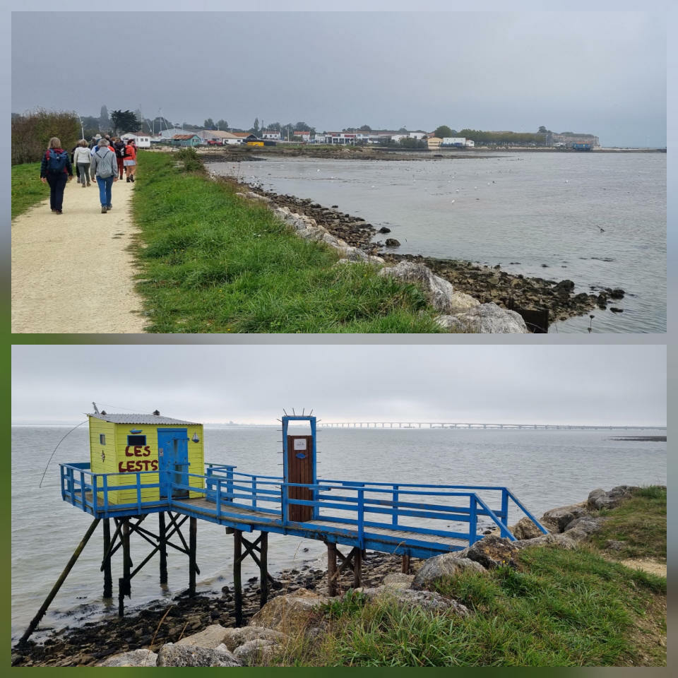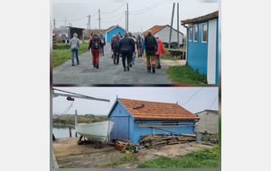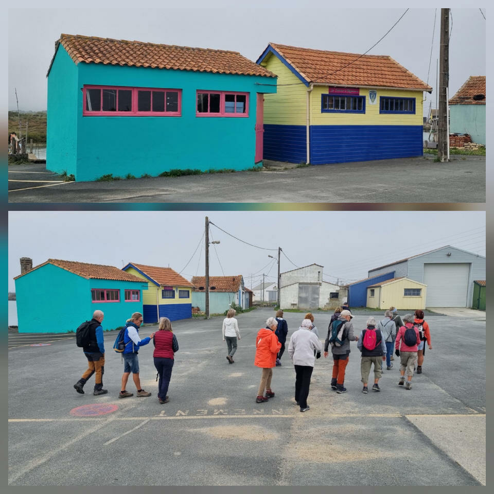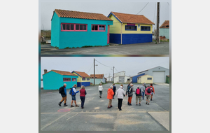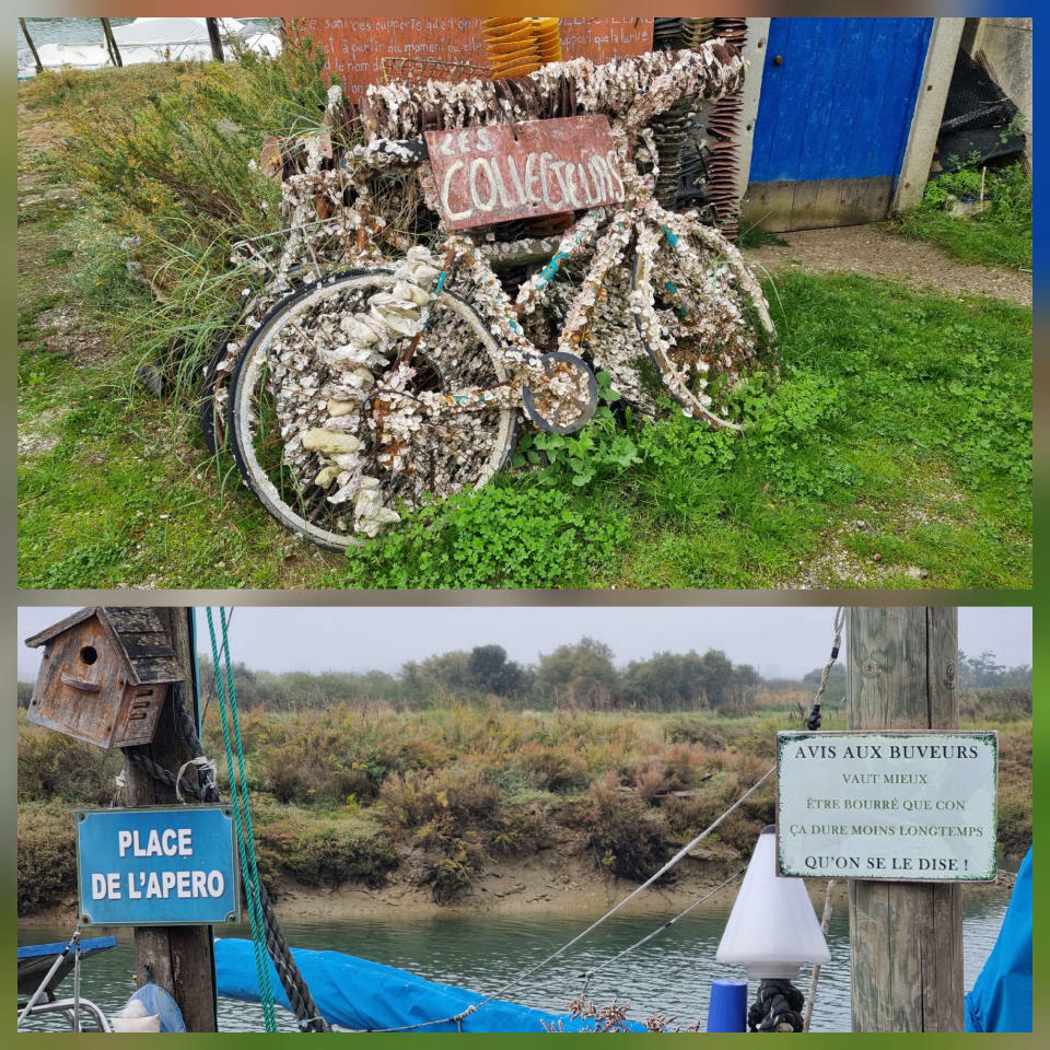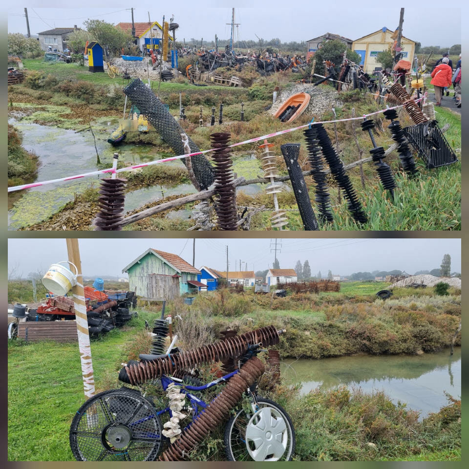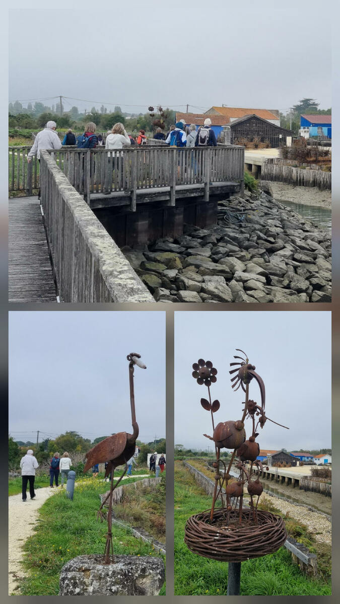 Nous entrons chez « Mr Souc » où le matériel ostréicole est transformé en du grand art surprenant du moment qu'il est recyclé, faut le faire ! Nous poursuivons par le chemin Tricard et Baudrier. Au port, nous dégustons les bananes confites d'Anne et le restant des sablés. Poursuite de la marche par la traversée de la D26 avec bonne prudence. C'est elle qui fait l'entrée/sortie de l'île. Nous prenons le chemin de la Mémoire qui longe la mer des Pertuis et le marais d'Oulme. Nous passons sa pointe et celle Blanche pour entrer dans le chemin des Oiseaux qui nous mène dans toute la partie ostréicole touristique et très colorées.