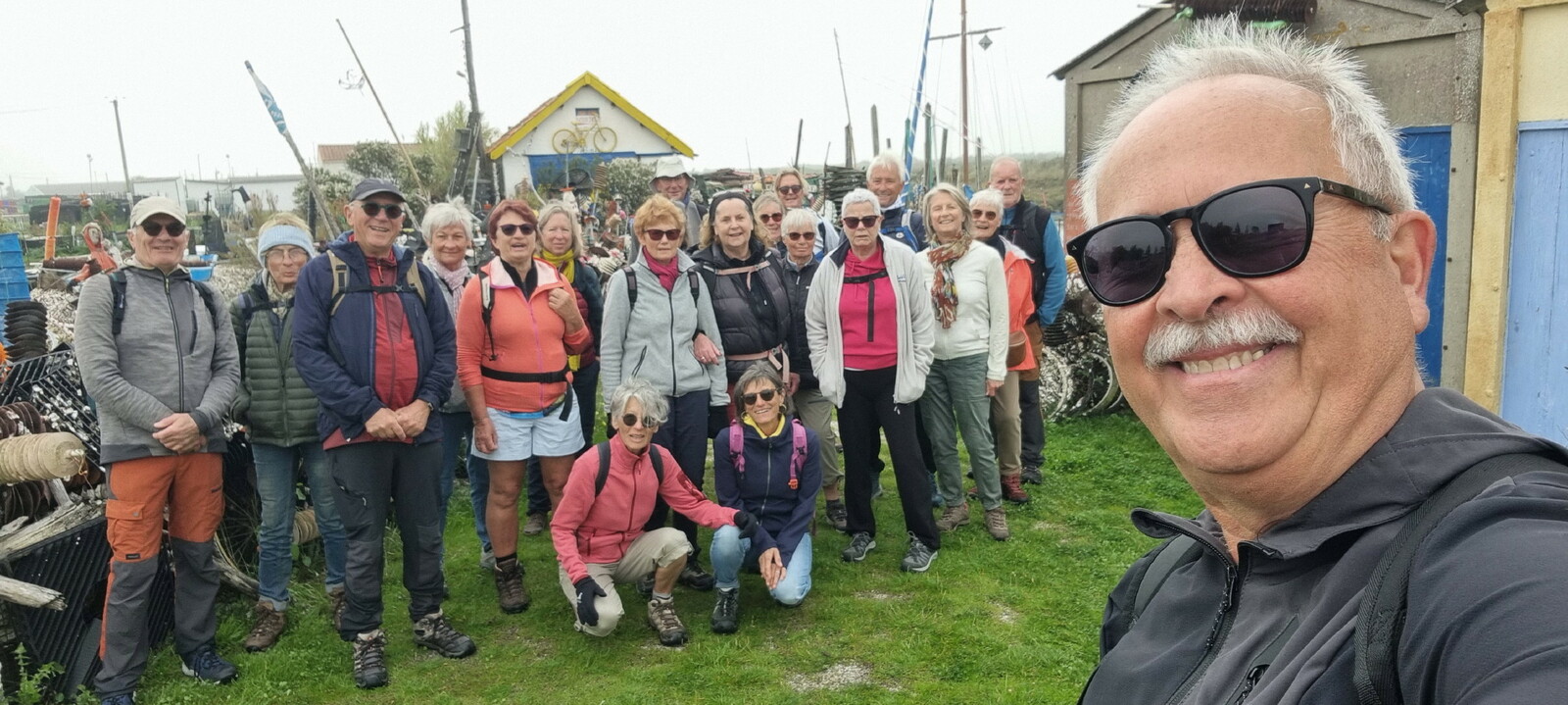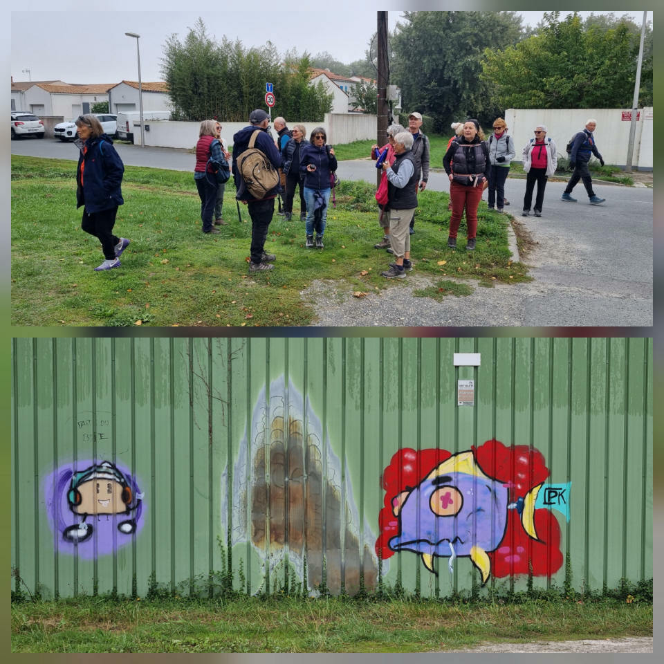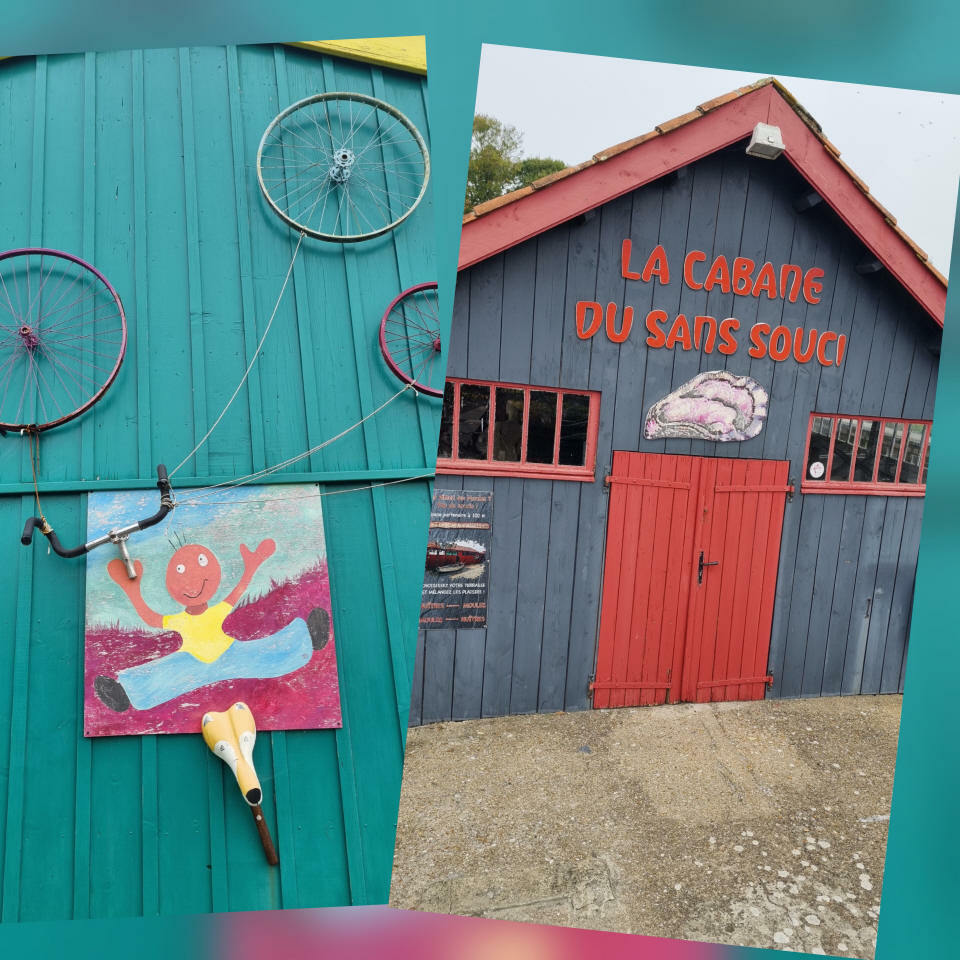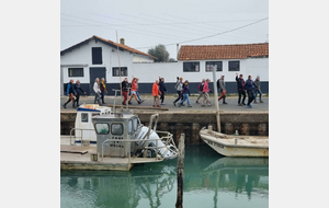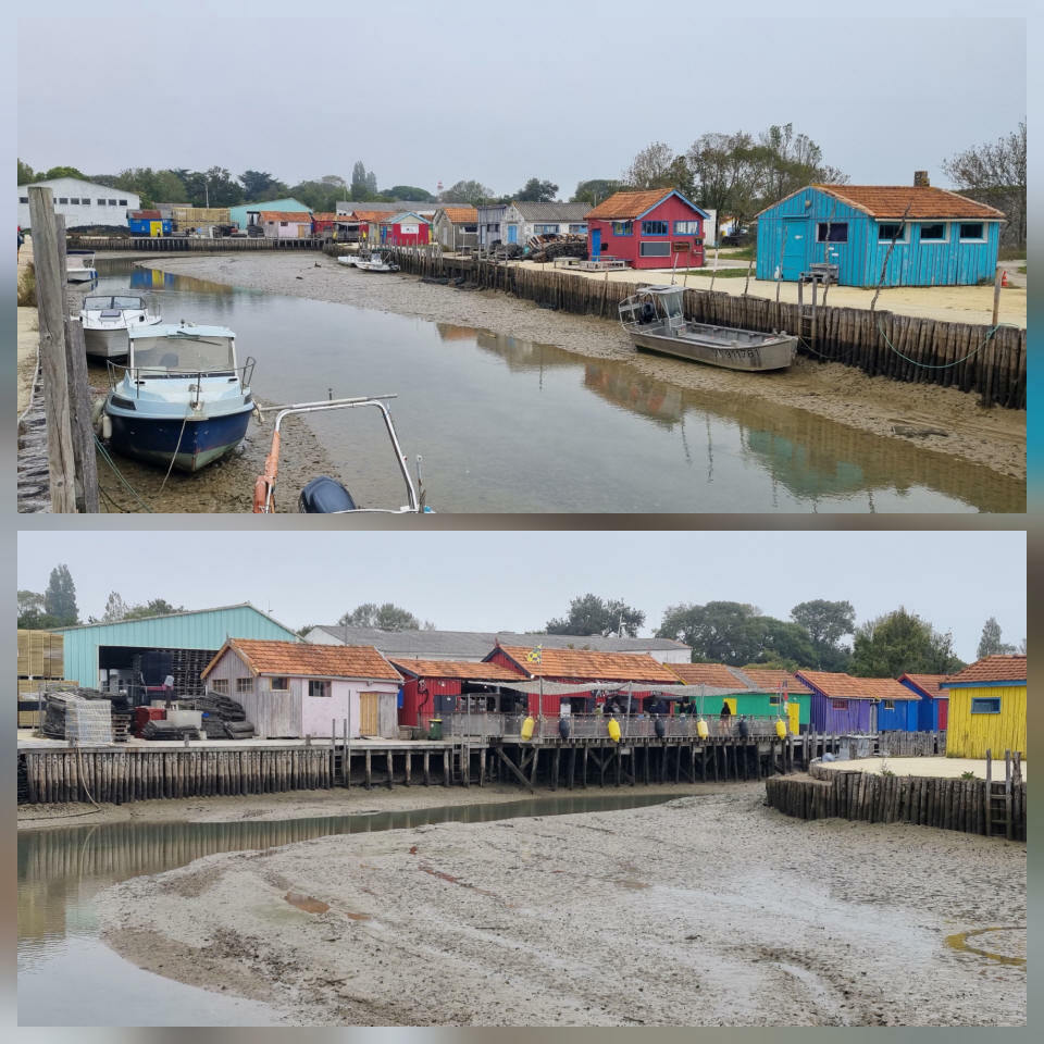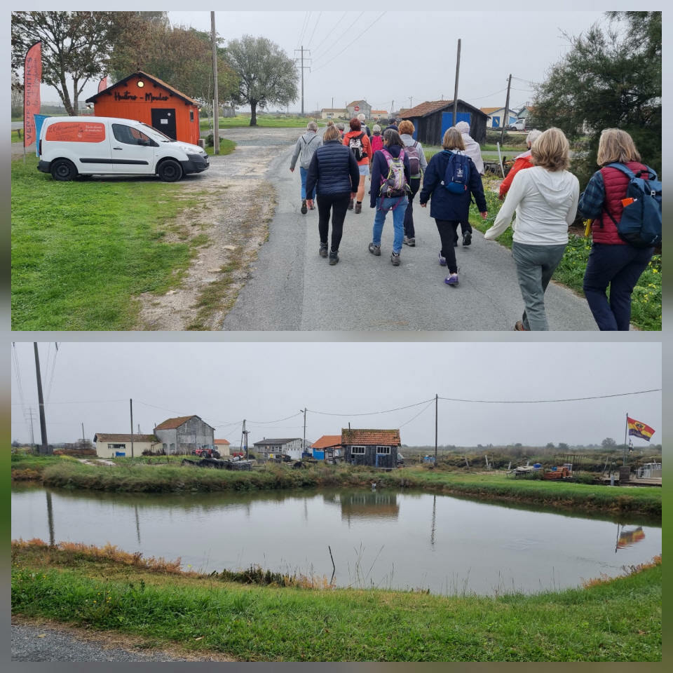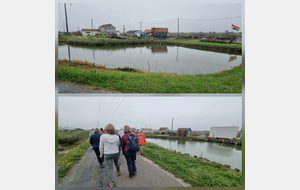 Nous entrons chez « Mr Souc » où le matériel ostréicole est transformé en du grand art surprenant du moment qu'il est recyclé, faut le faire ! Nous poursuivons par le chemin Tricard et Baudrier. Au port, nous dégustons les bananes confites d'Anne et le restant des sablés. Poursuite de la marche par la traversée de la D26 avec bonne prudence. C'est elle qui fait l'entrée/sortie de l'île. Nous prenons le chemin de la Mémoire qui longe la mer des Pertuis et le marais d'Oulme. Nous passons sa pointe et celle Blanche pour entrer dans le chemin des Oiseaux qui nous mène dans toute la partie ostréicole touristique et très colorées.
