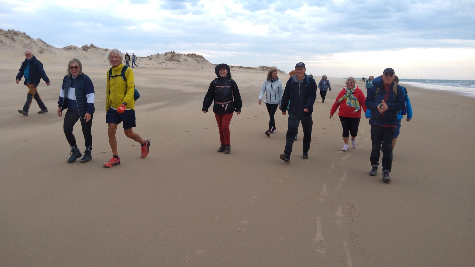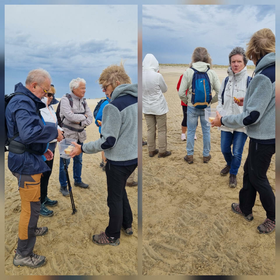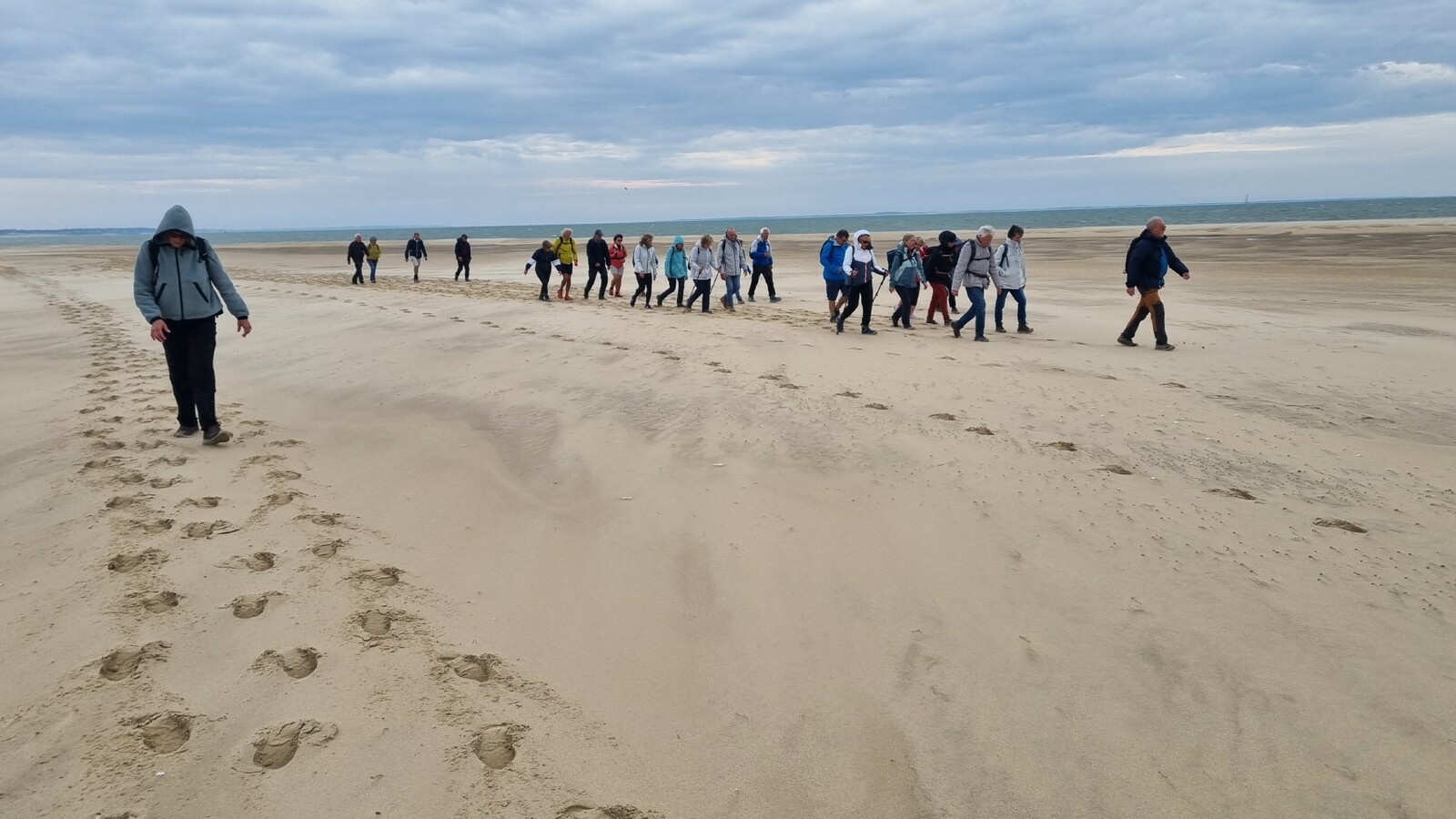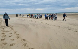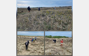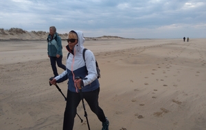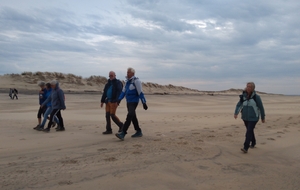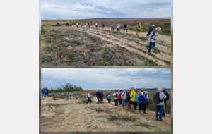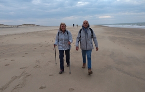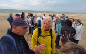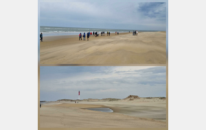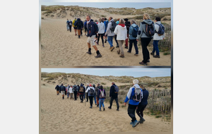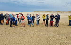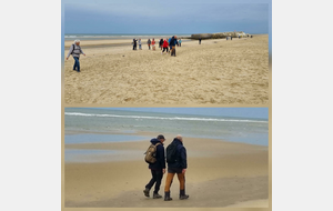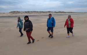 Il est omniprésent, dur, mou, moyen, fin, humide, trempé qu'on s'y enfonce ou pas, il faut l'affronter et de plus, le vent de face rend la marche plus dure. Bonjour les mollets, les cuissous, le cardio, ici il y a tout ce qu'il faut bien pour la santé. En parlant de cela, remerciement à Françoise pour la dégustation de son 4 quart. En fin, la Grande plage qui monte jusqu'à la Pointe Espagnole nous permet de marcher sur une surface tassée par la marée basse. Je reste sur les hauteurs, la marche est très soutenue, le vent fait cingler le sable sur les chaussures. A la hauteur d'un bunker du mur de l'Atlantique qui plonge dans la mer émeraude et l'ancien sémaphore, nous remontons de nouveau une dune au fort dénivelé. Arrivée à destination, nous ovationnons Gérard en l'honneur de tout cet exploit mené bon train dans un parcours difficile très bien orchestré.