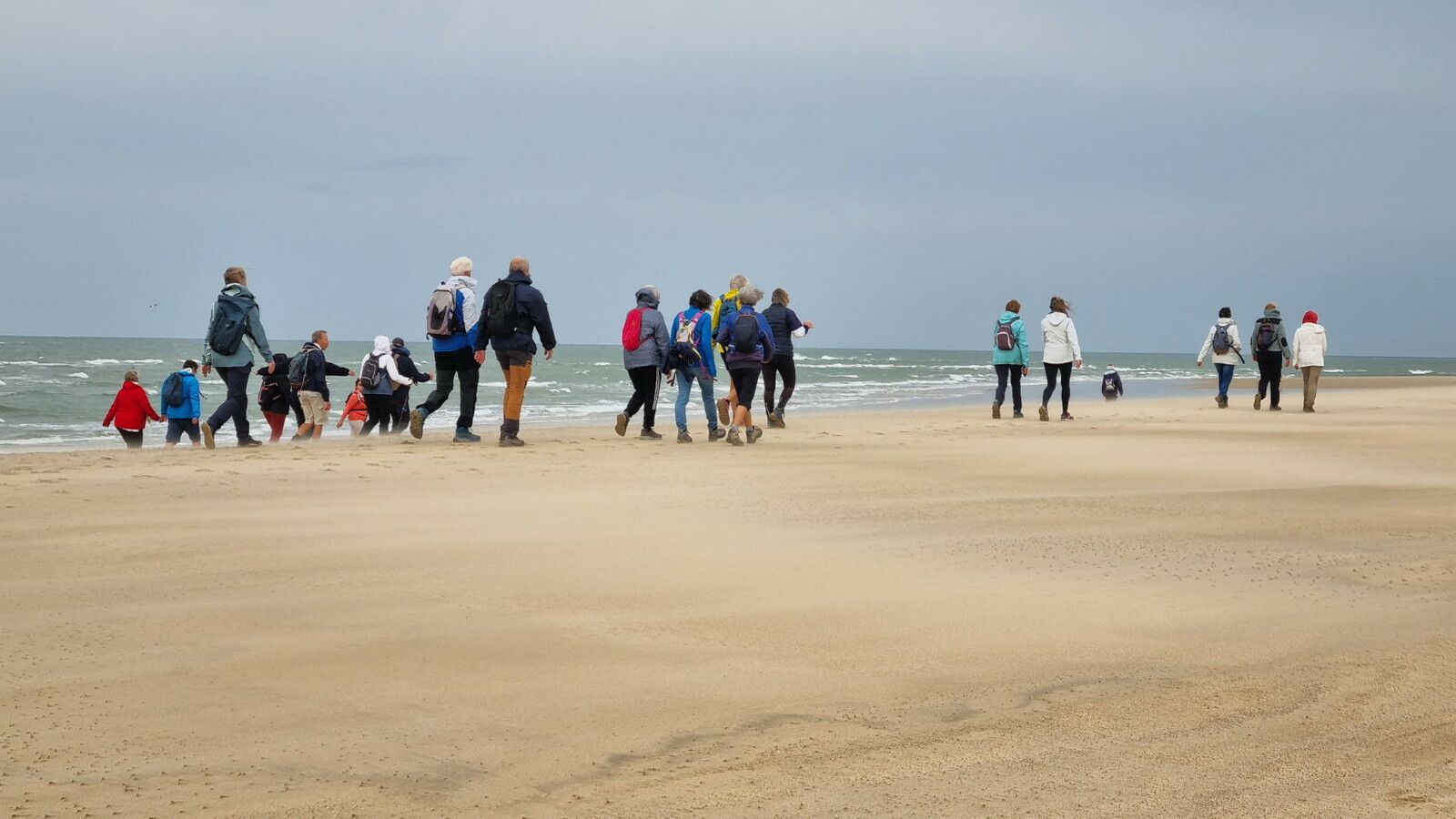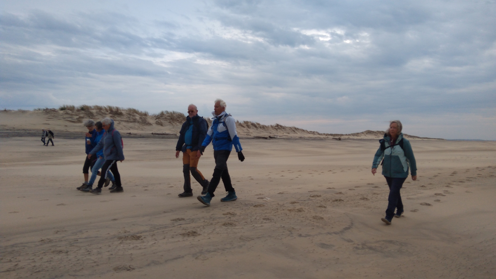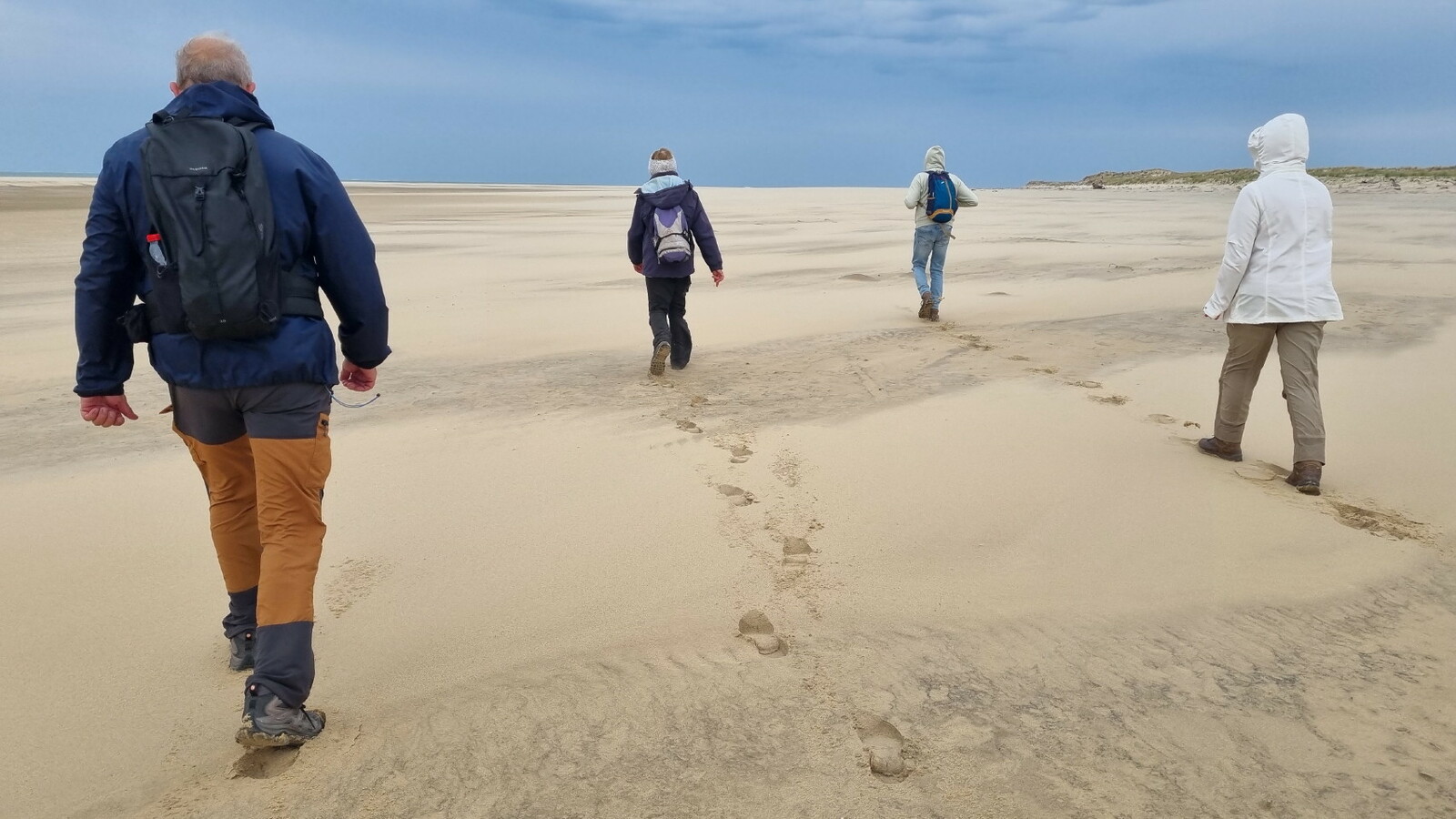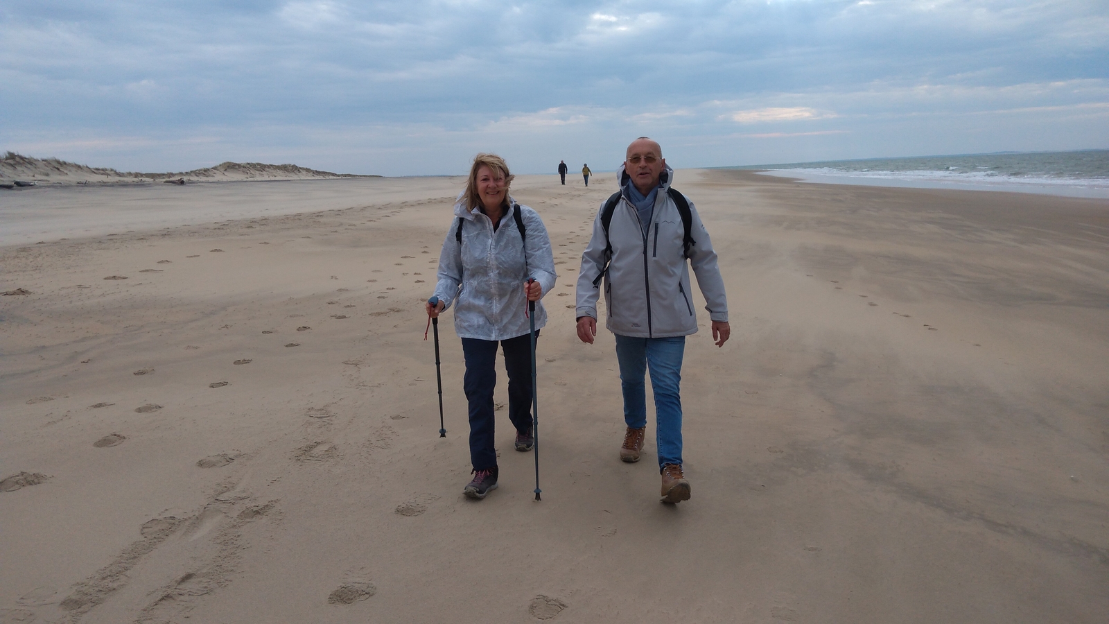 Il est omniprésent, dur, mou, moyen, fin, humide, trempé qu'on s'y enfonce ou pas, il faut l'affronter et de plus, le vent de face rend la marche plus dure. Bonjour les mollets, les cuissous, le cardio, ici il y a tout ce qu'il faut bien pour la santé. En parlant de cela, remerciement à Françoise pour la dégustation de son 4 quart. En fin, la Grande plage qui monte jusqu'à la Pointe Espagnole nous permet de marcher sur une surface tassée par la marée basse. Je reste sur les hauteurs, la marche est très soutenue, le vent fait cingler le sable sur les chaussures. A la hauteur d'un bunker du mur de l'Atlantique qui plonge dans la mer émeraude et l'ancien sémaphore, nous remontons de nouveau une dune au fort dénivelé. Arrivée à destination, nous ovationnons Gérard en l'honneur de tout cet exploit mené bon train dans un parcours difficile très bien orchestré.