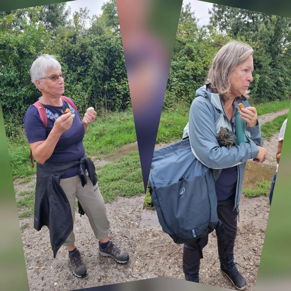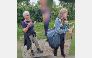 De notre côté, nous poursuivons par le sentier des Passereaux et parvenons au marais de la Briqueterie par le chemin du même nom. Passé les serres de la Chenaunoine et la station d'épuration aux odeurs nauséabondes, nous longeons le Rivaux canal ou quelques moustiques s'invitent à nous picorer. Sous une courte pluie battante on s'engage dans le marais de la Brandelle. Aux portes de Chenaunoine, une pose s'organise et on se régale avec les meringues d'Annie et les carrés cake de Laurence (hum ! Tout est bon). Rue Pasteur du Désert, voir la plaque historique, nous fonçons par le chemin du Terreau traverser la campagne de Chenaunoine avec une belle vue sur les hauteurs de sa région. Sortie du chemin de l'Enclouse au lieu-dit Le Berceau, nous longeons la D145 dans son fossé pour notre sécurité.
