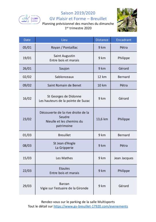 Planning prévisionnel marche du dimanche 1er trimestre 2020