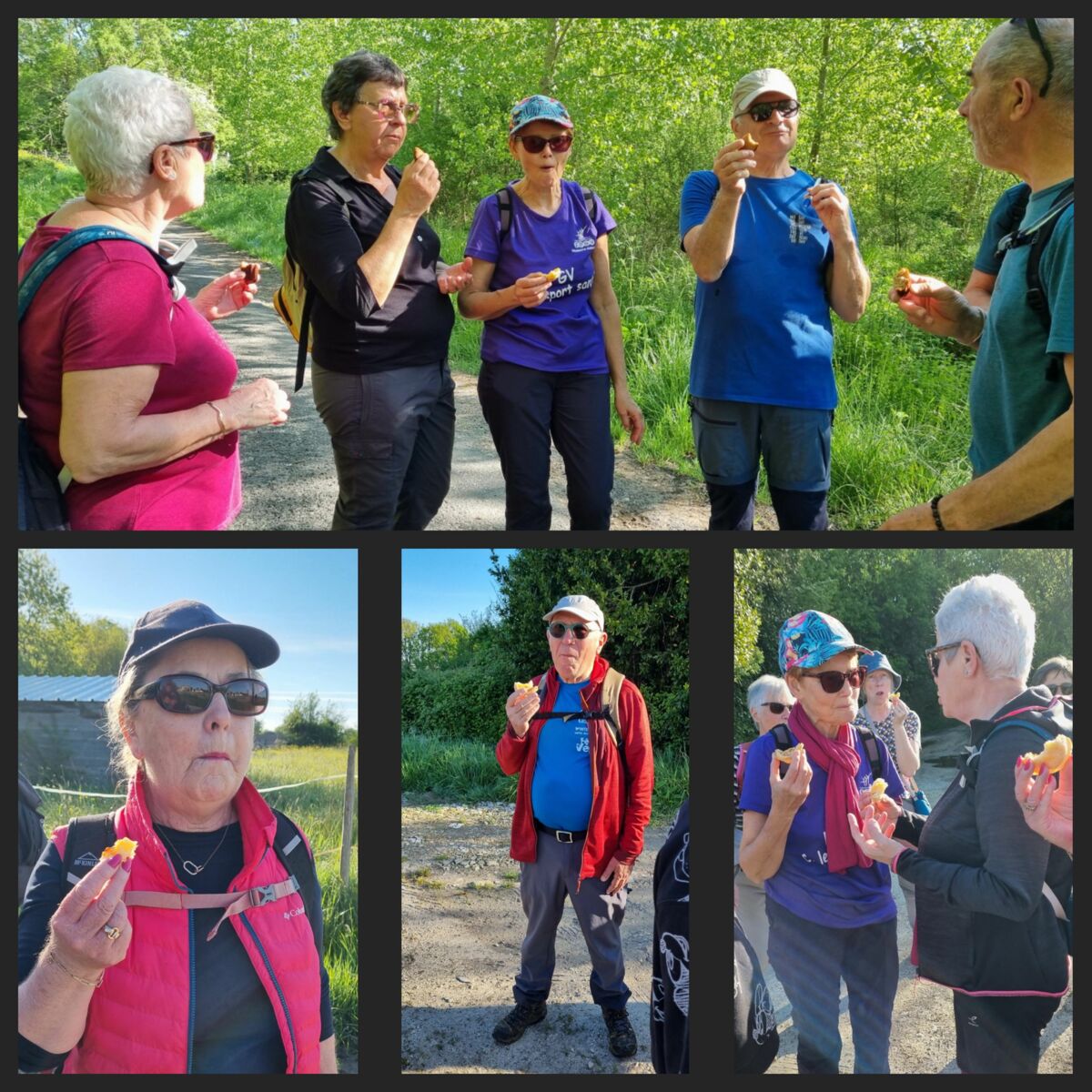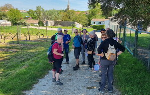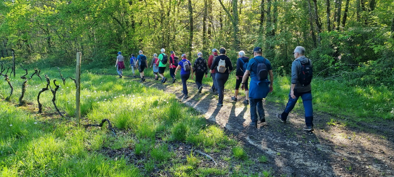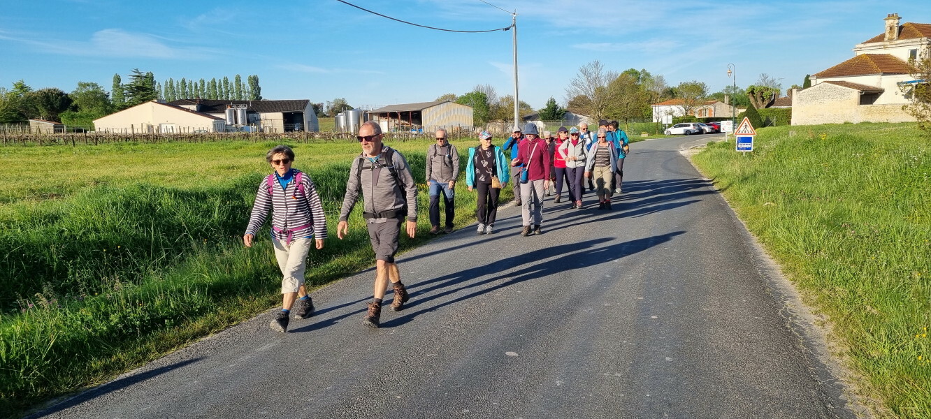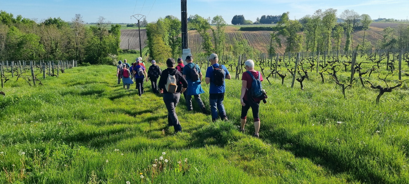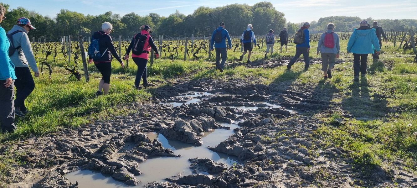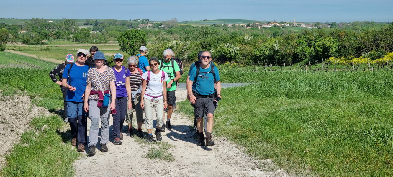 Au chemin des Robineries, nous gâtent de chouquettes et madeleines maison au sarrasin. La rando se poursuit dans les vaux de La Bordé, puis on emprunte le GR360 par la source du Bouil pour reprendre le chemin du Château d'Eau, celui des Ruisselles dont les hauteurs dominent la Gironde, le clocher de Barzan et pour nous, la pose. Les derniers dénivelés brut du Petit Chenac ne peuvent que nous mettre en appétit.