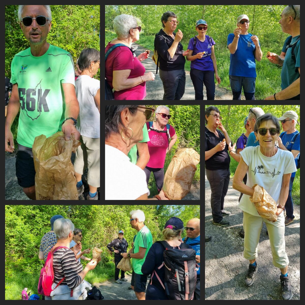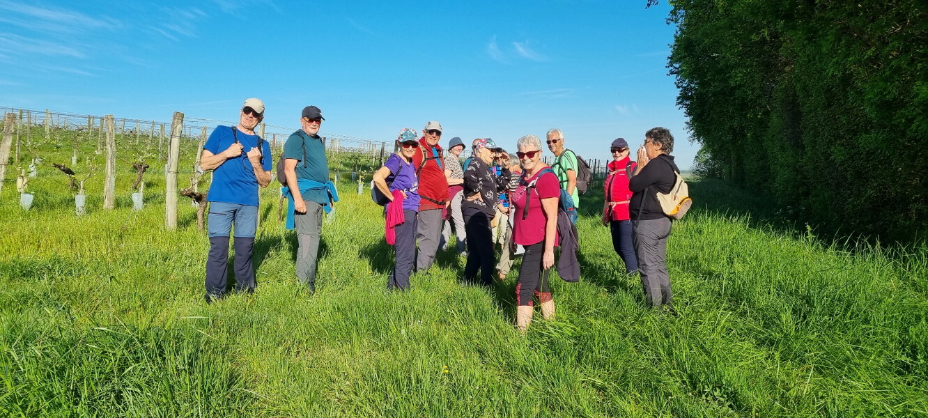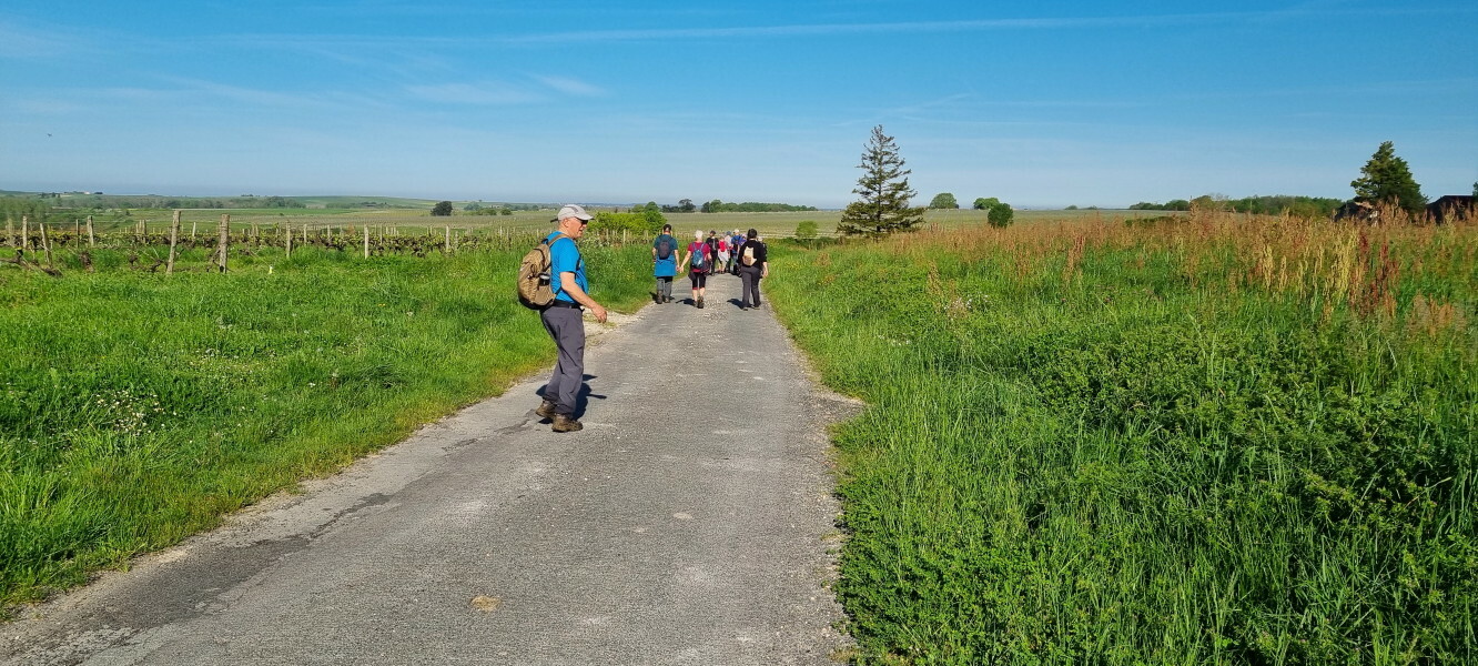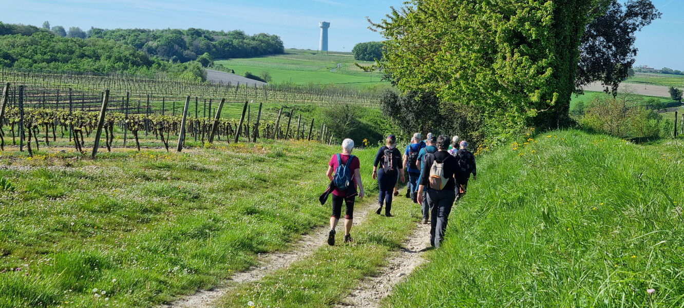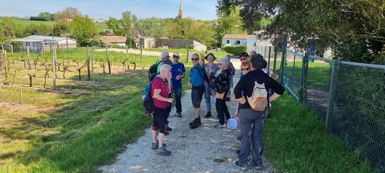Au chemin des Robineries, nous gâtent de chouquettes et madeleines maison au sarrasin. La rando se poursuit dans les vaux de La Bordé, puis on emprunte le GR360 par la source du Bouil pour reprendre le chemin du Château d'Eau, celui des Ruisselles dont les hauteurs dominent la Gironde, le clocher de Barzan et pour nous, la pose. Les derniers dénivelés brut du Petit Chenac ne peuvent que nous mettre en appétit.