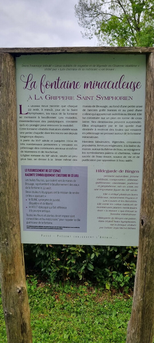 Passés la halle (XVIIe siècle) où le marché est déjà bien installé, l’Église Saint-Jean-Baptiste (édifice primitif roman est mentionné dès 1047), la rue Noire et la Seigneurie, nous passons par le Pas de l'Ane, les Baconnières, La Barlerie et atteignons La Gripperie par la rue de Labadaire. La longue rue de St Symphorien, ou clématites Montana et arbres de Judée dominent, nous amène dans de bonnes odeurs d'ensilage de La Ferme de Brouage.