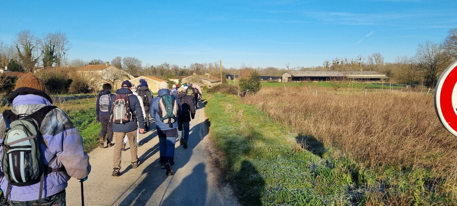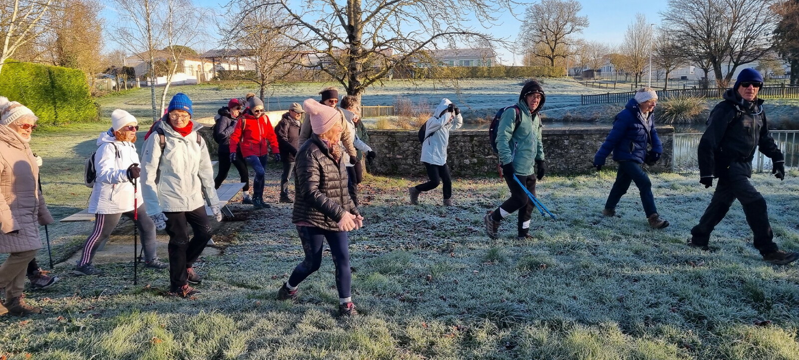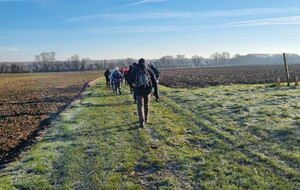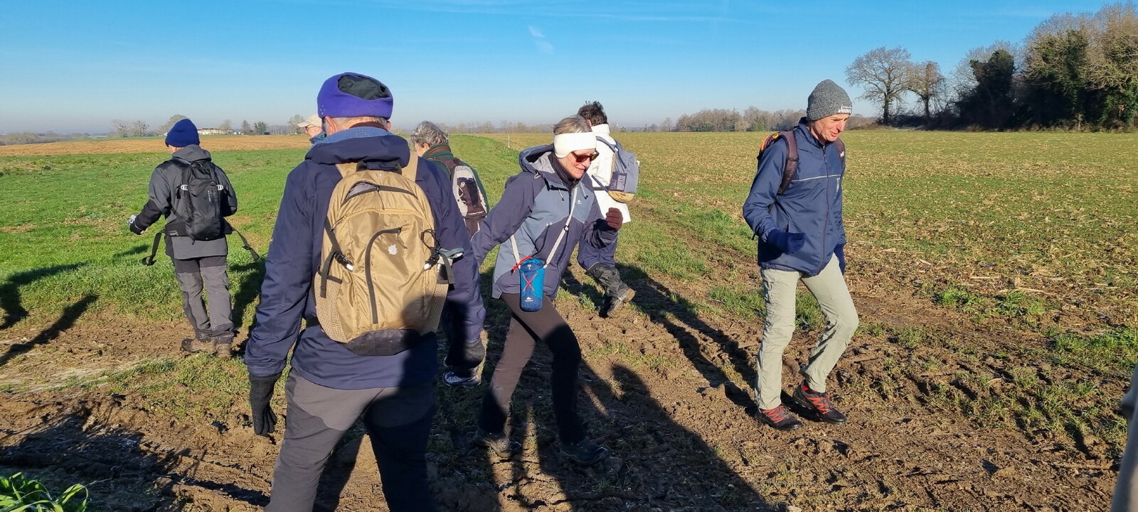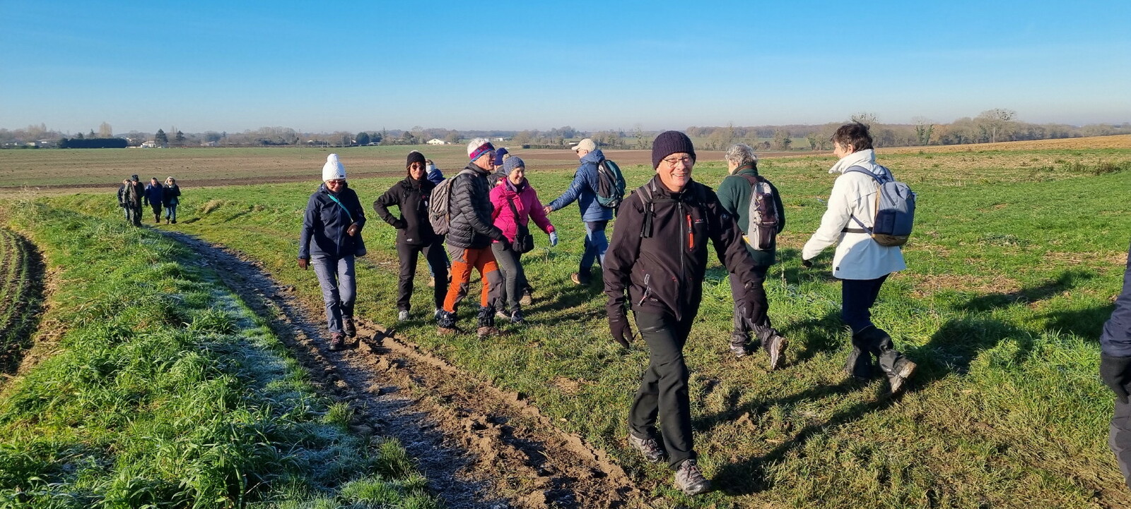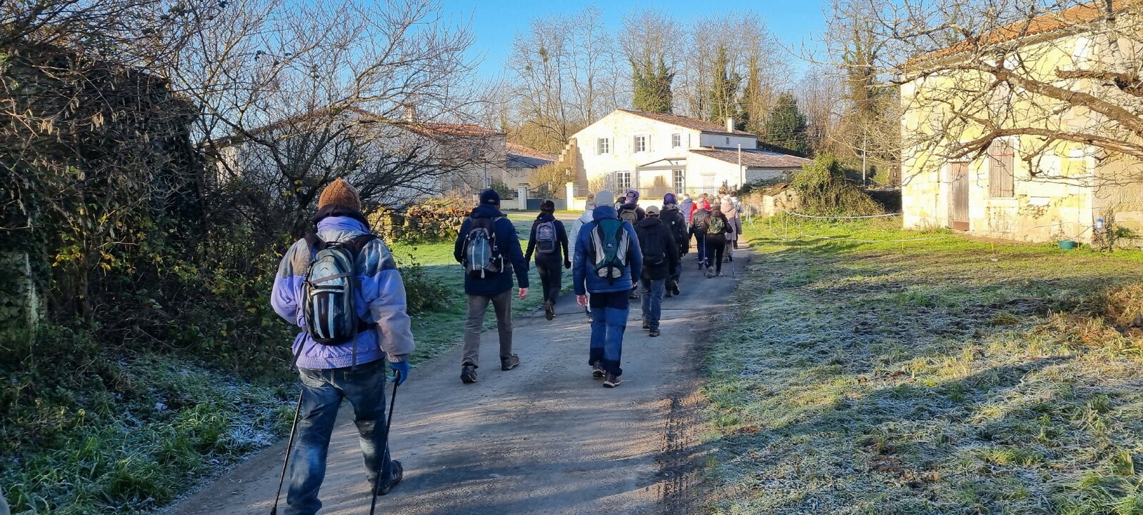 Les bonnets n'ont quitté personne; temps sec, froid de canard, 2° et des chemins gelés dans la belle campagne de Rétaud. Enfin pas d'eau, du ciel bleu et un magnifique soleil. Depuis la place de l'église St Trojan, à l'étroit parking, la trace nous mène par les Moulins des Bodins, la ferme bovine au St Christophe, le passage de Hillairets, le chemin des Fontaines, le Muguet, la Guerinaille, Beaulieu.