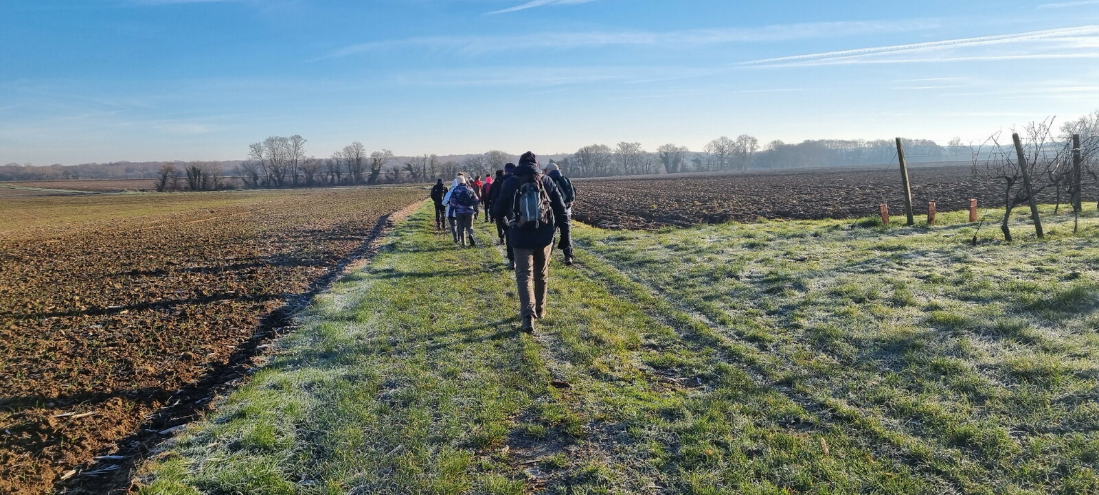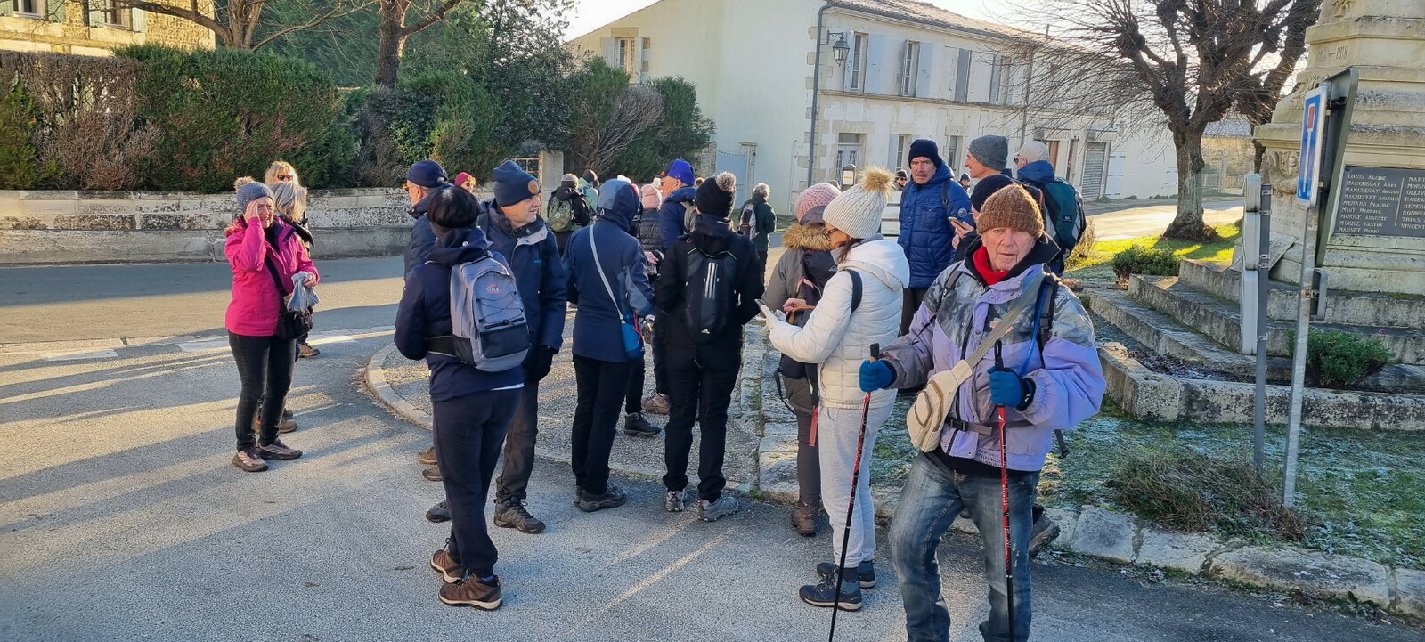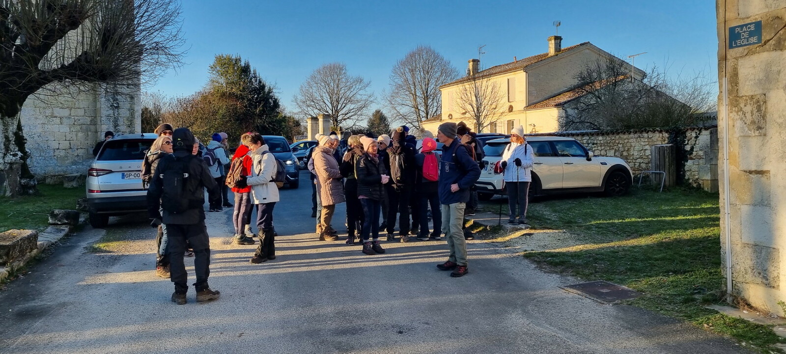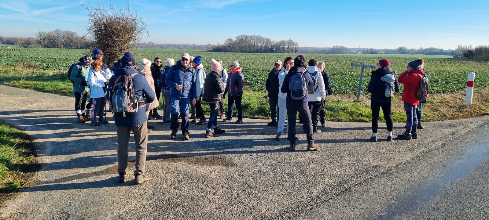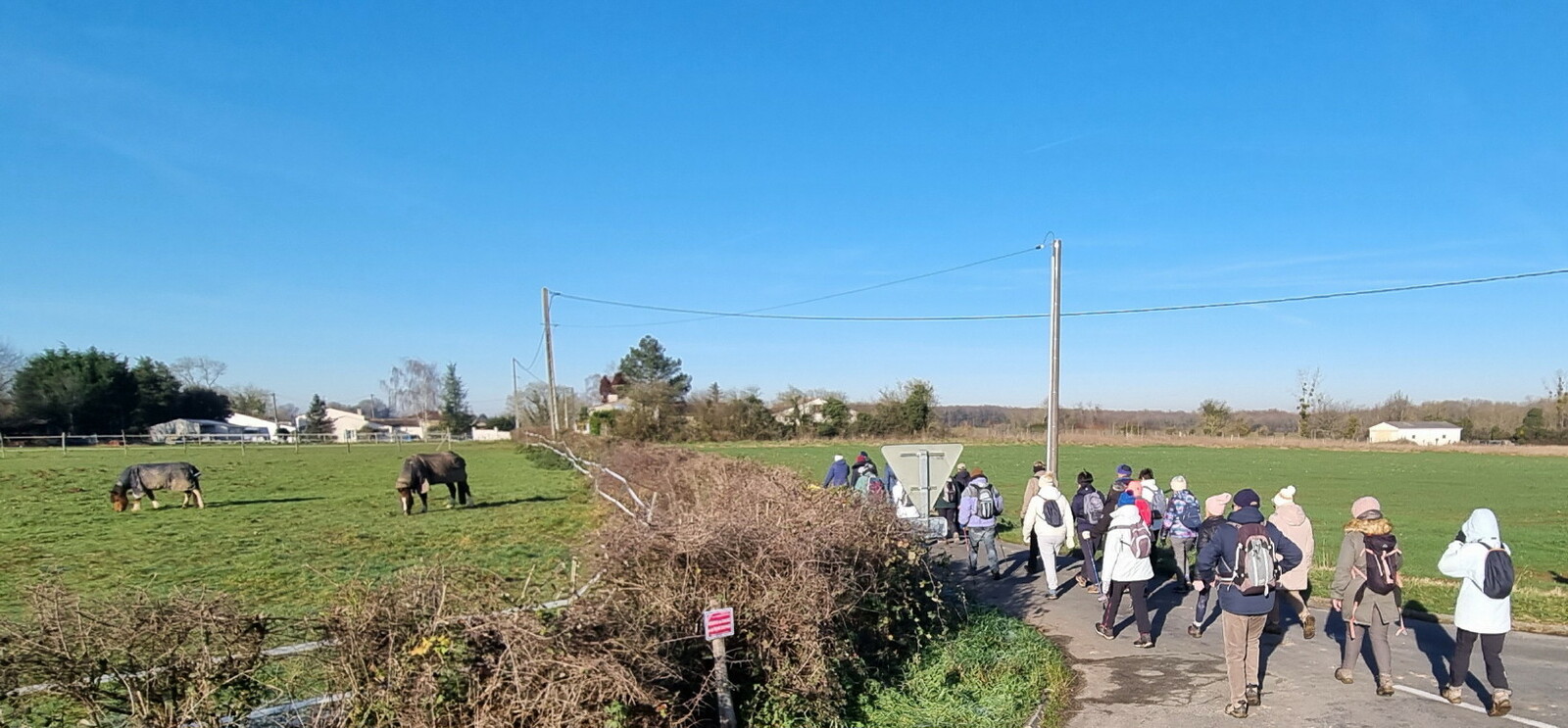 Les bonnets n'ont quitté personne; temps sec, froid de canard, 2° et des chemins gelés dans la belle campagne de Rétaud. Enfin pas d'eau, du ciel bleu et un magnifique soleil. Depuis la place de l'église St Trojan, à l'étroit parking, la trace nous mène par les Moulins des Bodins, la ferme bovine au St Christophe, le passage de Hillairets, le chemin des Fontaines, le Muguet, la Guerinaille, Beaulieu.