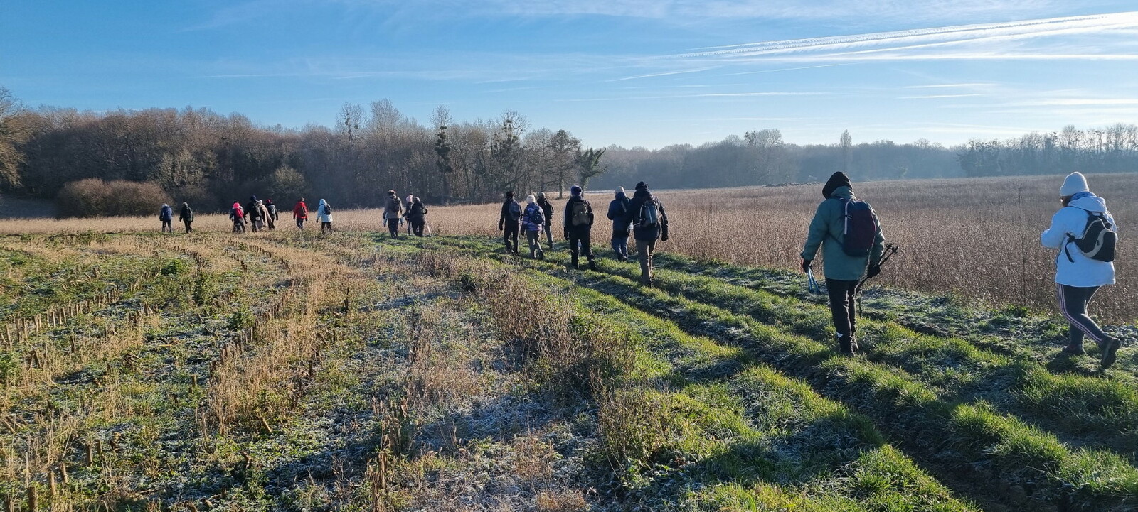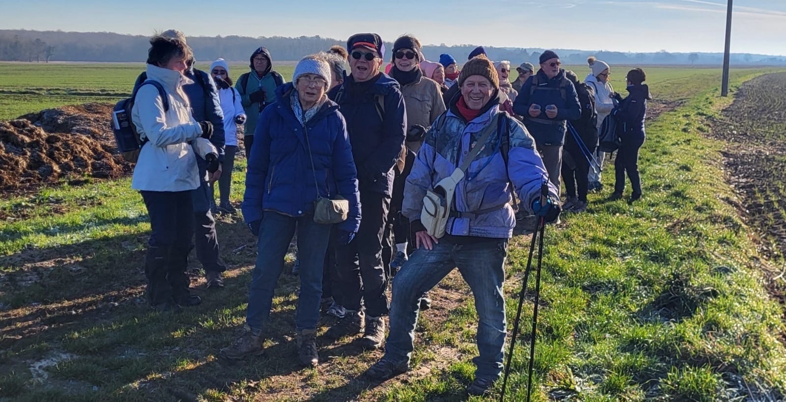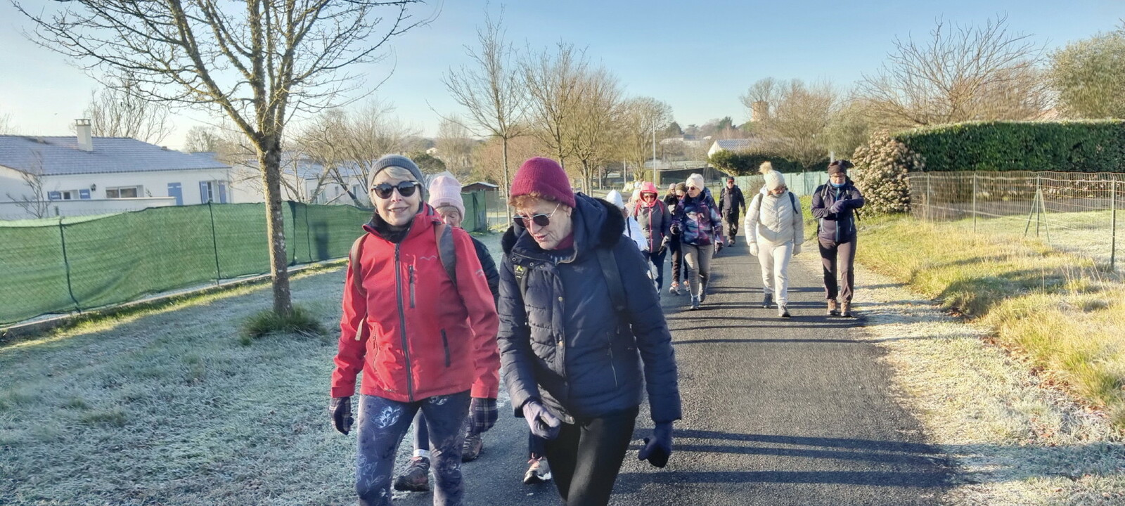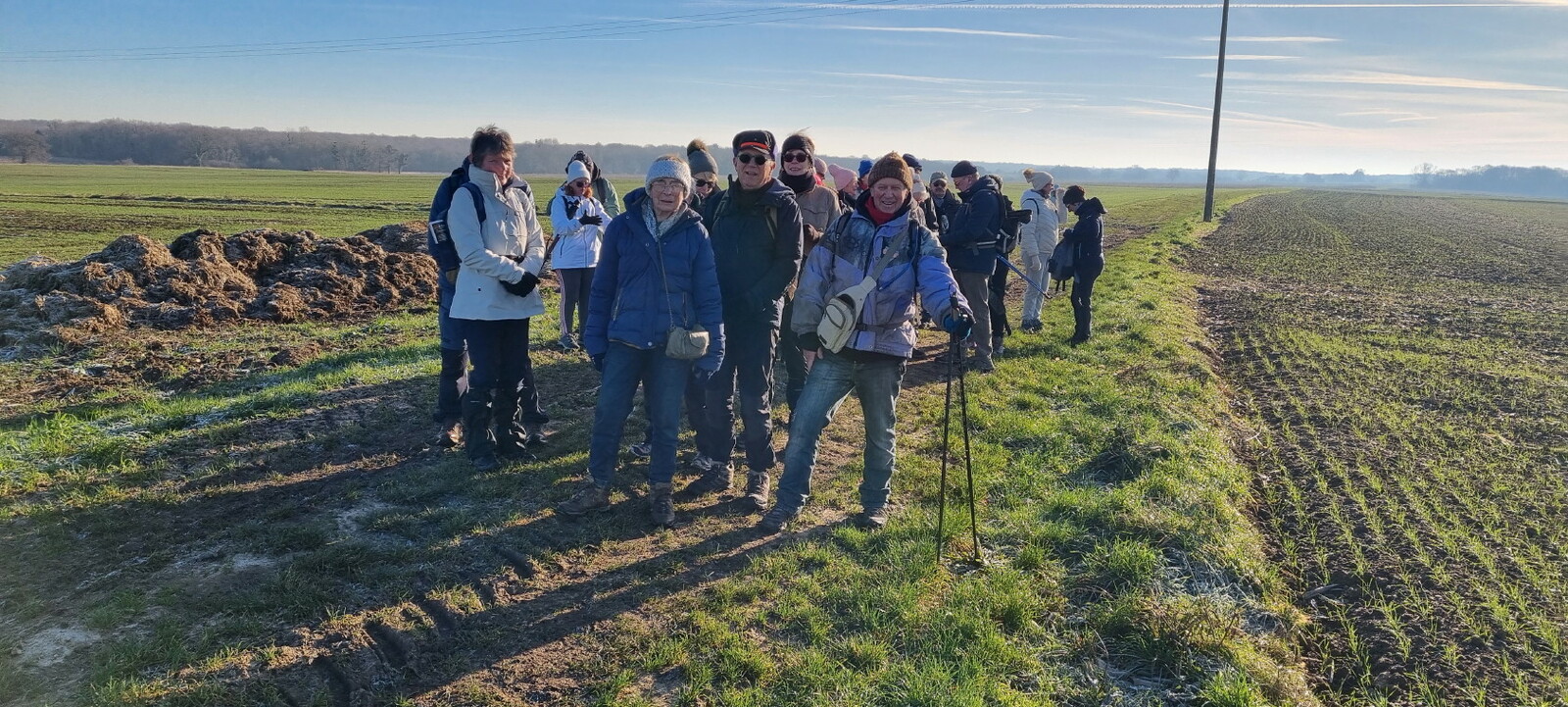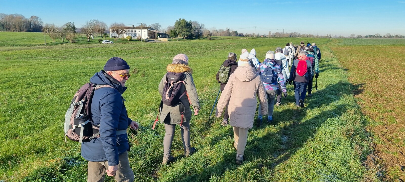 Les bonnets n'ont quitté personne; temps sec, froid de canard, 2° et des chemins gelés dans la belle campagne de Rétaud. Enfin pas d'eau, du ciel bleu et un magnifique soleil. Depuis la place de l'église St Trojan, à l'étroit parking, la trace nous mène par les Moulins des Bodins, la ferme bovine au St Christophe, le passage de Hillairets, le chemin des Fontaines, le Muguet, la Guerinaille, Beaulieu.