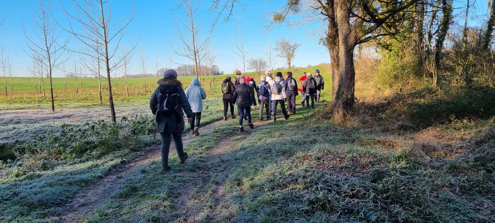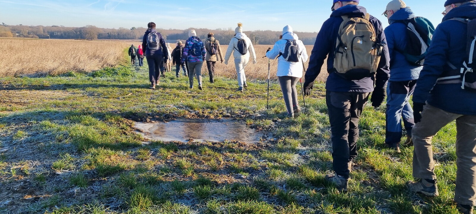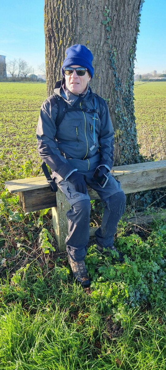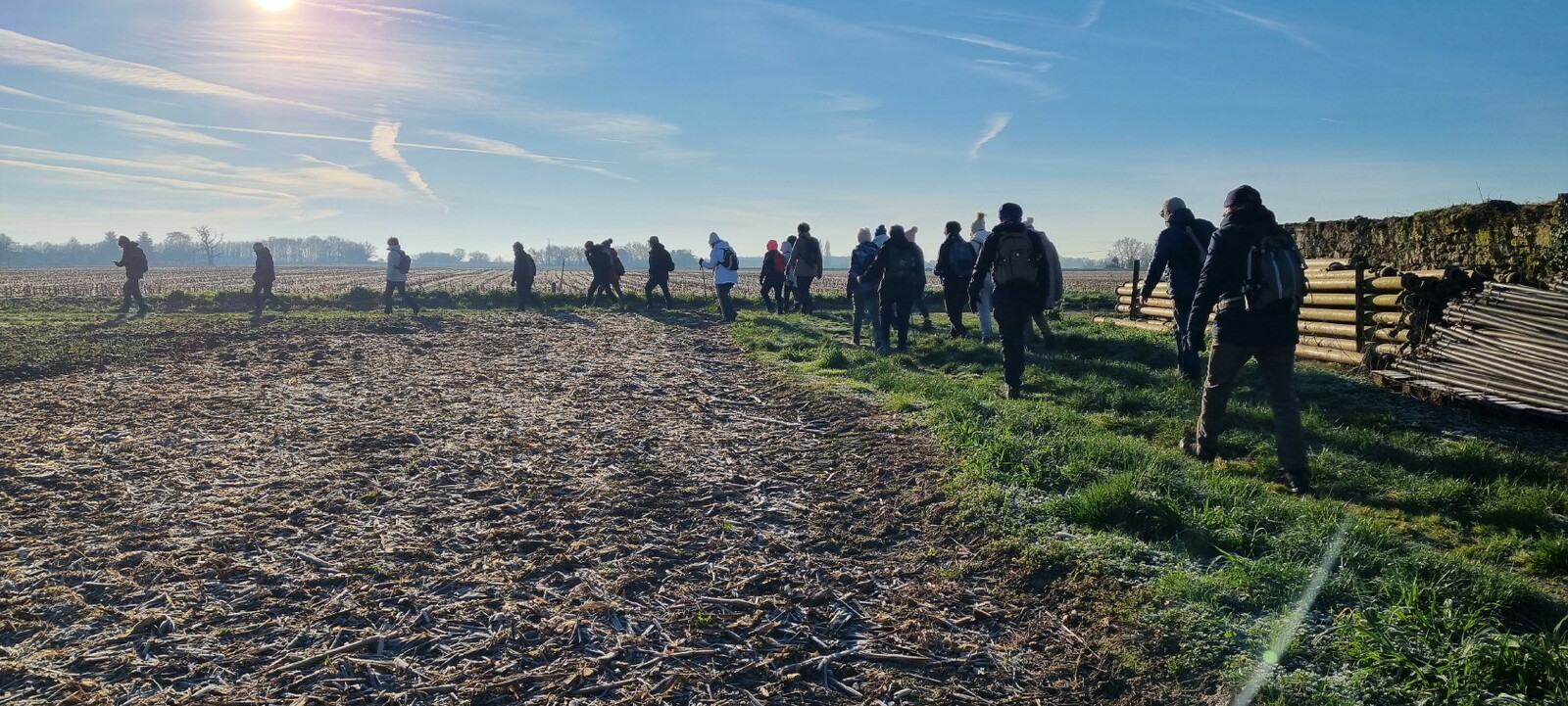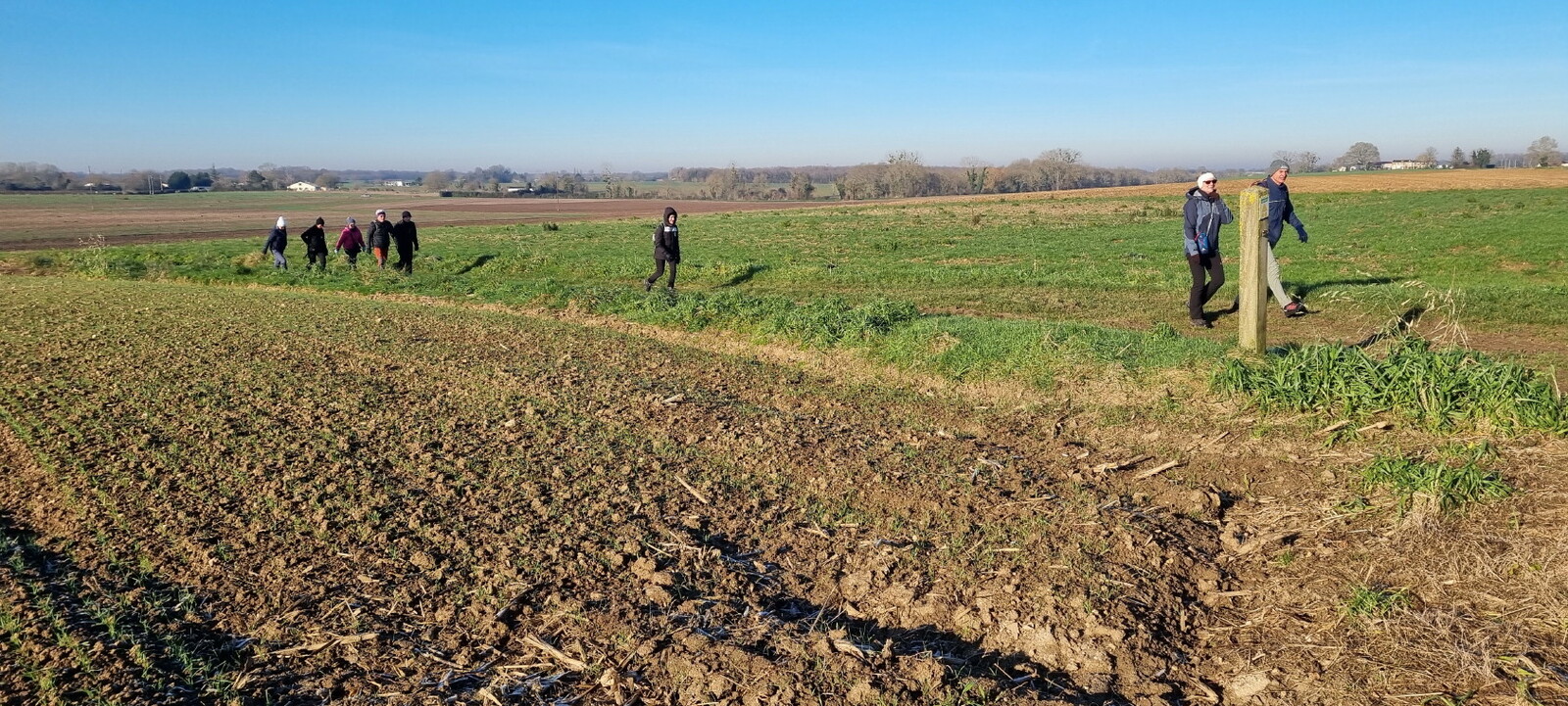 Les bonnets n'ont quitté personne; temps sec, froid de canard, 2° et des chemins gelés dans la belle campagne de Rétaud. Enfin pas d'eau, du ciel bleu et un magnifique soleil. Depuis la place de l'église St Trojan, à l'étroit parking, la trace nous mène par les Moulins des Bodins, la ferme bovine au St Christophe, le passage de Hillairets, le chemin des Fontaines, le Muguet, la Guerinaille, Beaulieu.