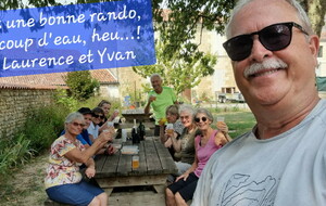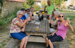 Dans le jardin de la mairie et à la façon d'une aventure d'Astérix et d'Obélix, tout se termine dans la joie et la bonne humeur autour de la table de Laurence et Yvan qui nous offrent rosé, cidre breton, crackers, mini saucissons et bâtonnets de bretzels.