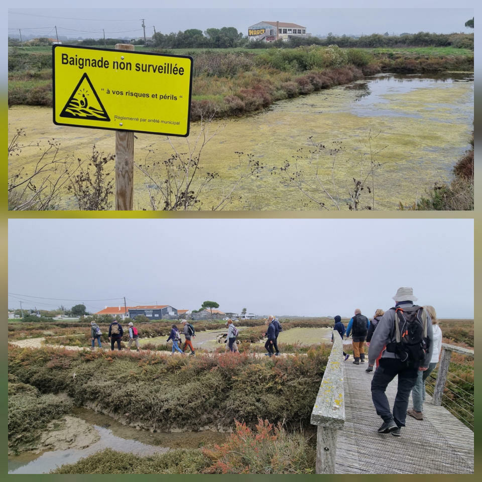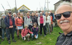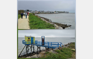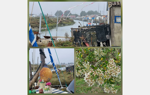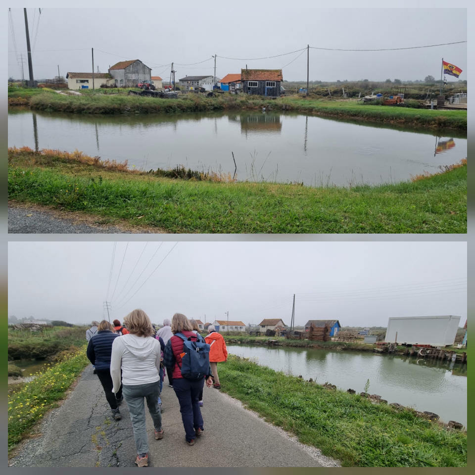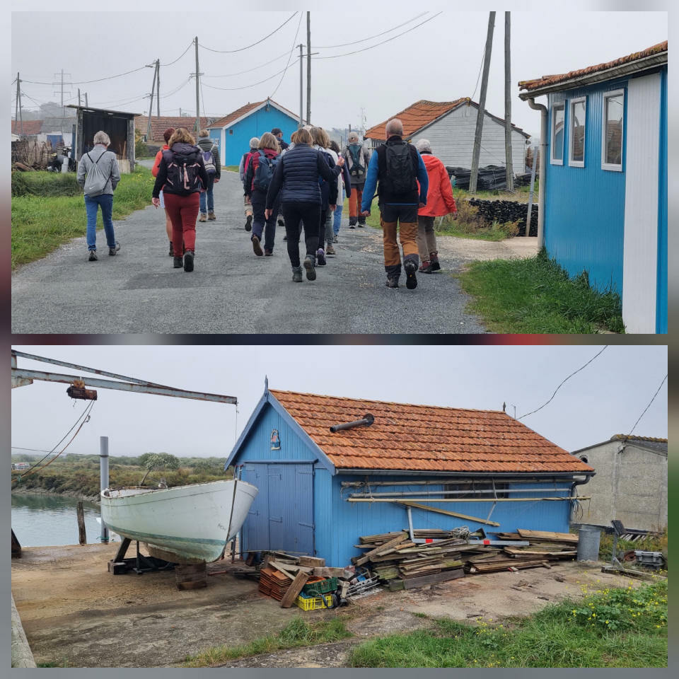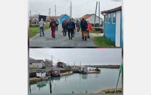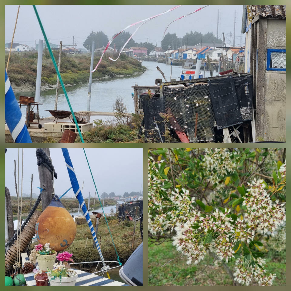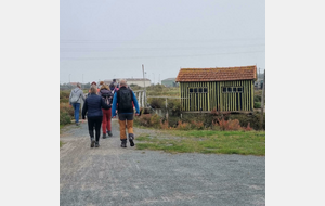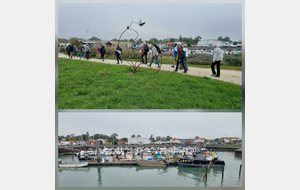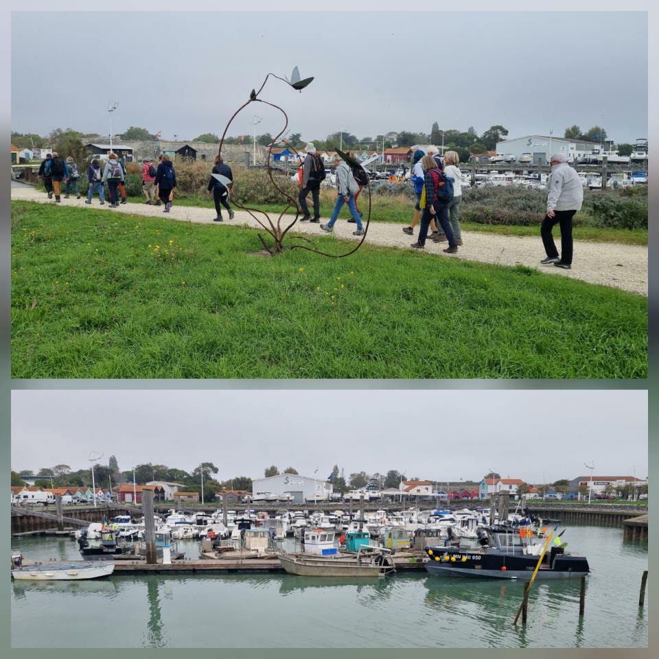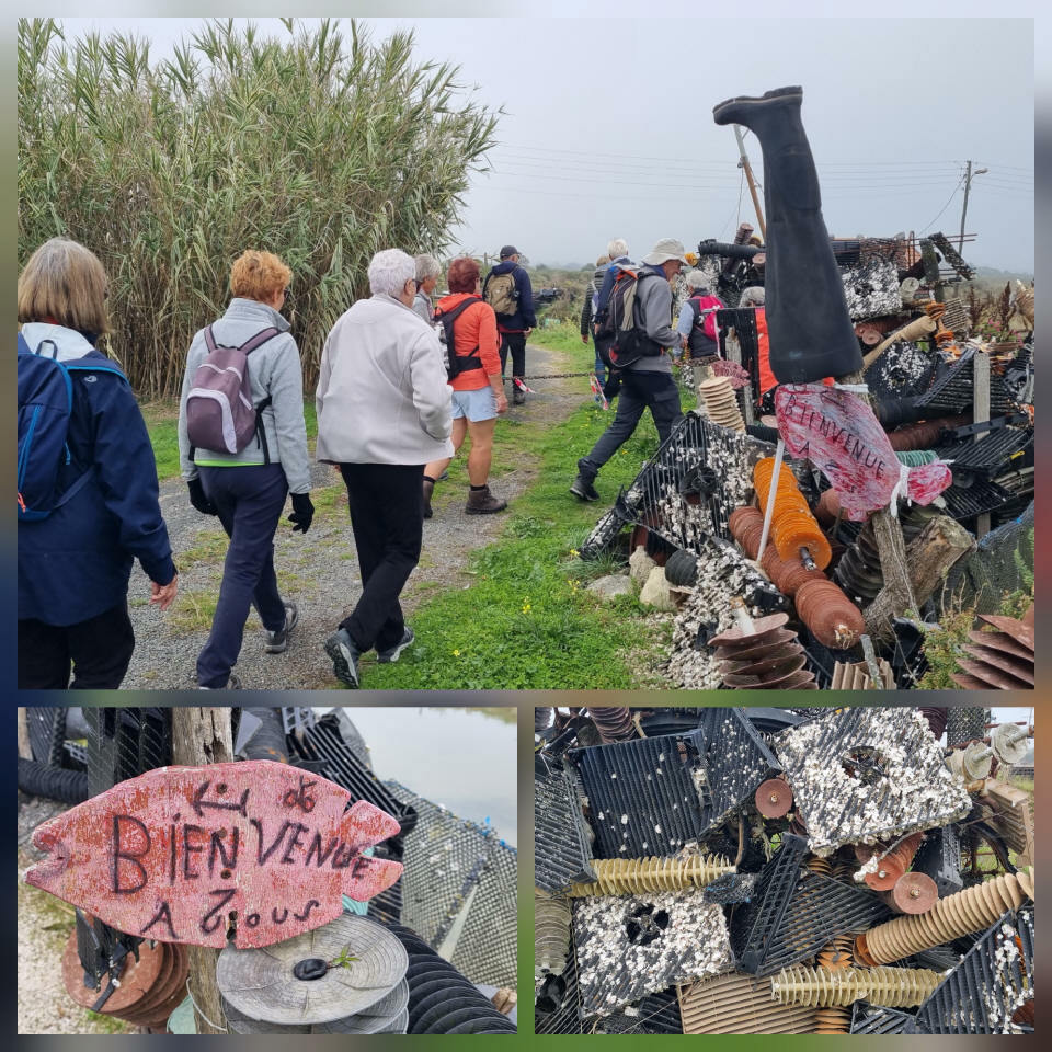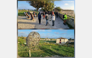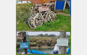Nous entrons chez « Mr Souc » où le matériel ostréicole est transformé en du grand art surprenant du moment qu'il est recyclé, faut le faire ! Nous poursuivons par le chemin Tricard et Baudrier. Au port, nous dégustons les bananes confites d'Anne et le restant des sablés. Poursuite de la marche par la traversée de la D26 avec bonne prudence. C'est elle qui fait l'entrée/sortie de l'île. Nous prenons le chemin de la Mémoire qui longe la mer des Pertuis et le marais d'Oulme. Nous passons sa pointe et celle Blanche pour entrer dans le chemin des Oiseaux qui nous mène dans toute la partie ostréicole touristique et très colorées.