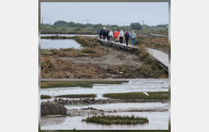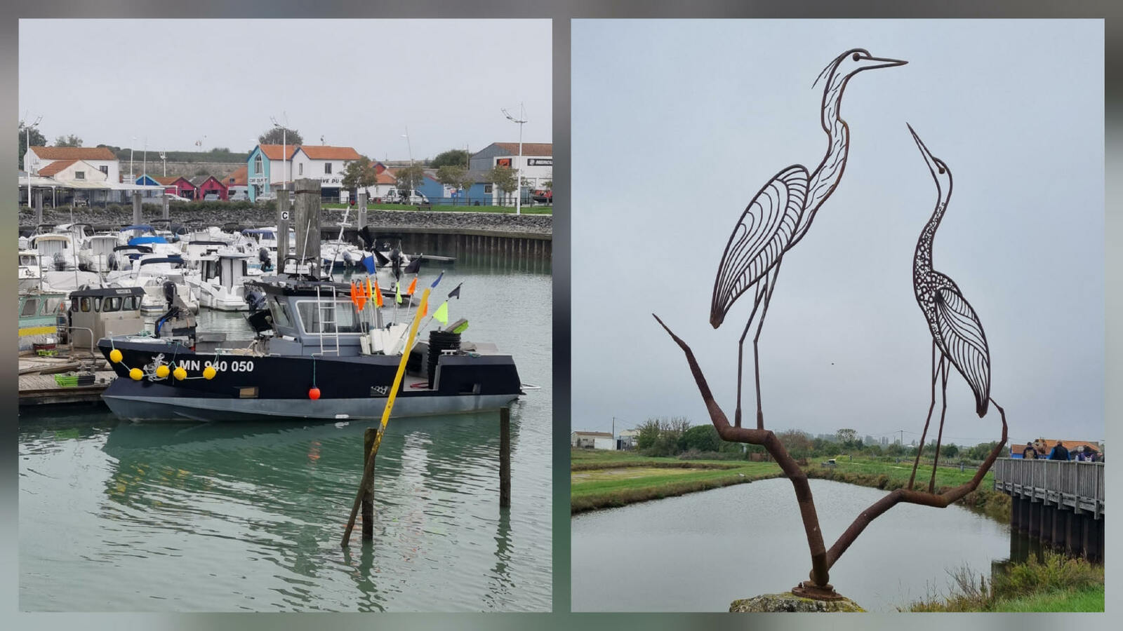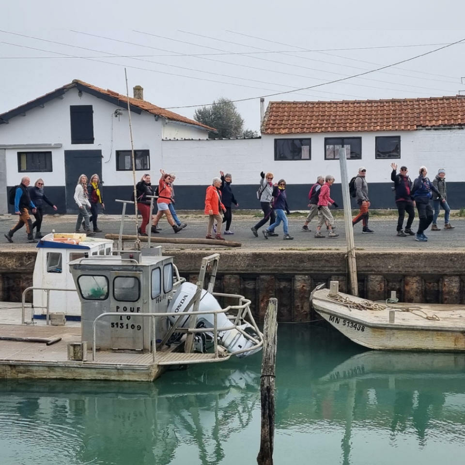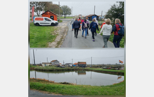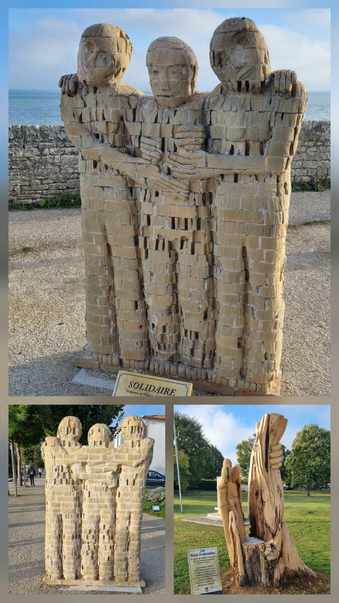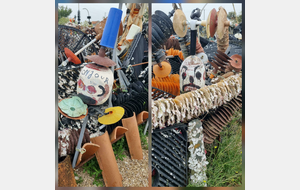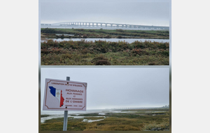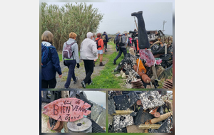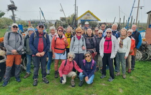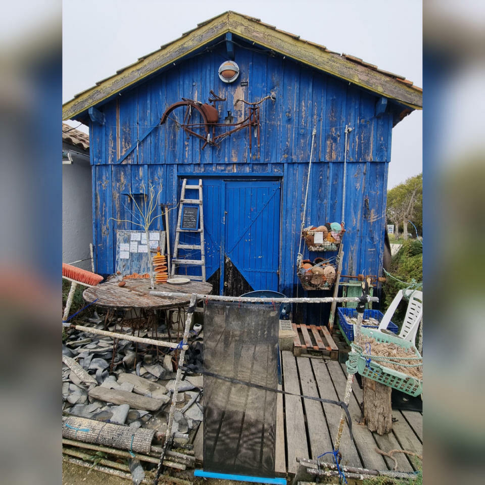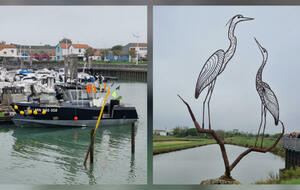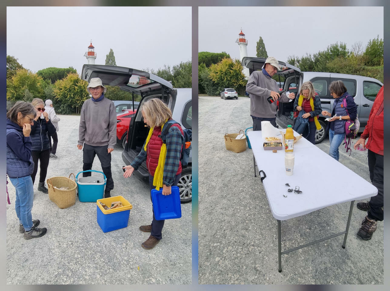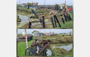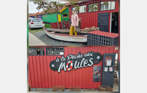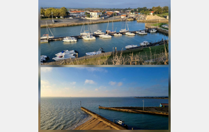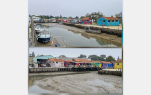 Nous entrons chez « Mr Souc » où le matériel ostréicole est transformé en du grand art surprenant du moment qu'il est recyclé, faut le faire ! Nous poursuivons par le chemin Tricard et Baudrier. Au port, nous dégustons les bananes confites d'Anne et le restant des sablés. Poursuite de la marche par la traversée de la D26 avec bonne prudence. C'est elle qui fait l'entrée/sortie de l'île. Nous prenons le chemin de la Mémoire qui longe la mer des Pertuis et le marais d'Oulme. Nous passons sa pointe et celle Blanche pour entrer dans le chemin des Oiseaux qui nous mène dans toute la partie ostréicole touristique et très colorées.