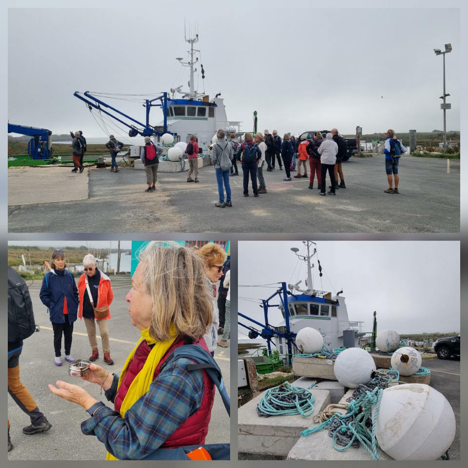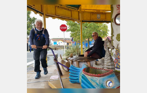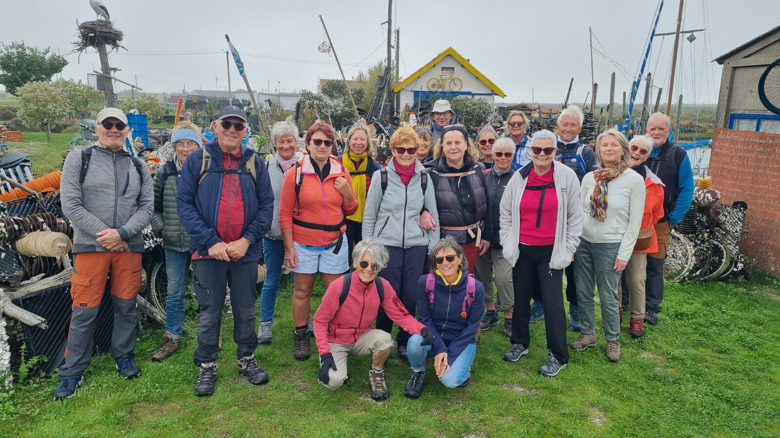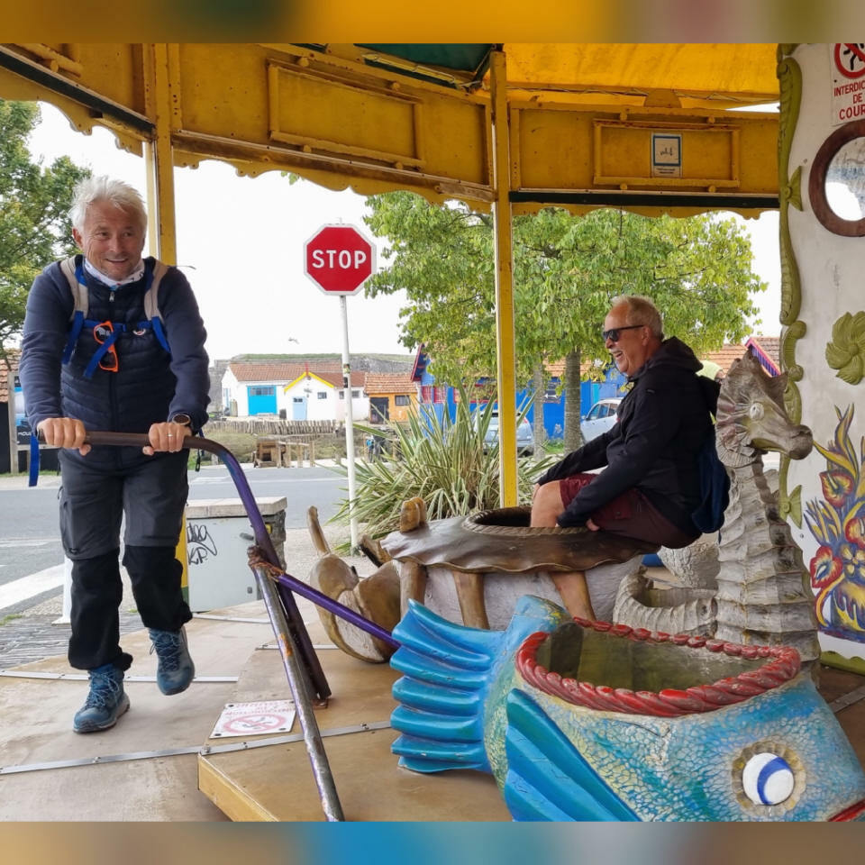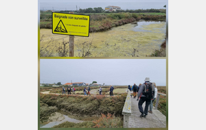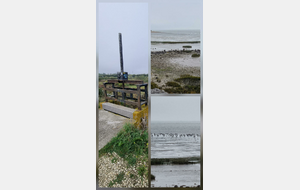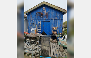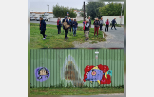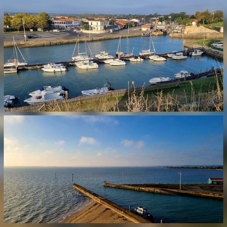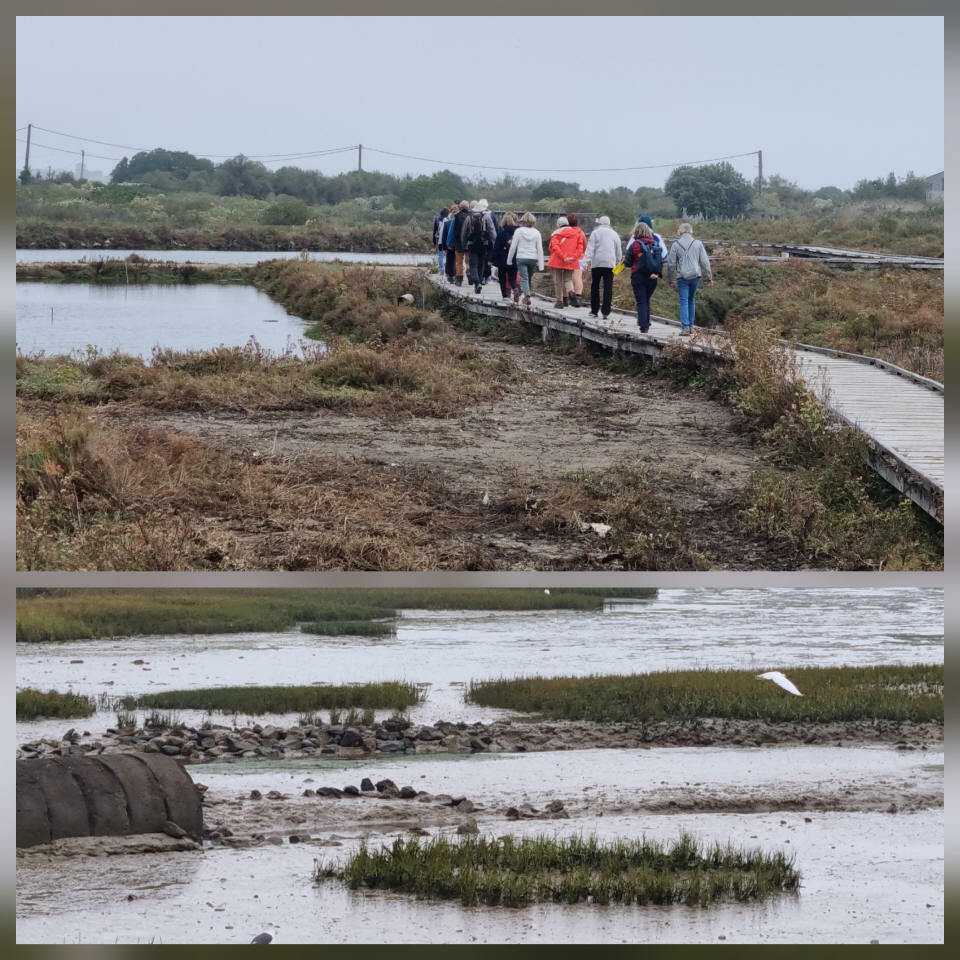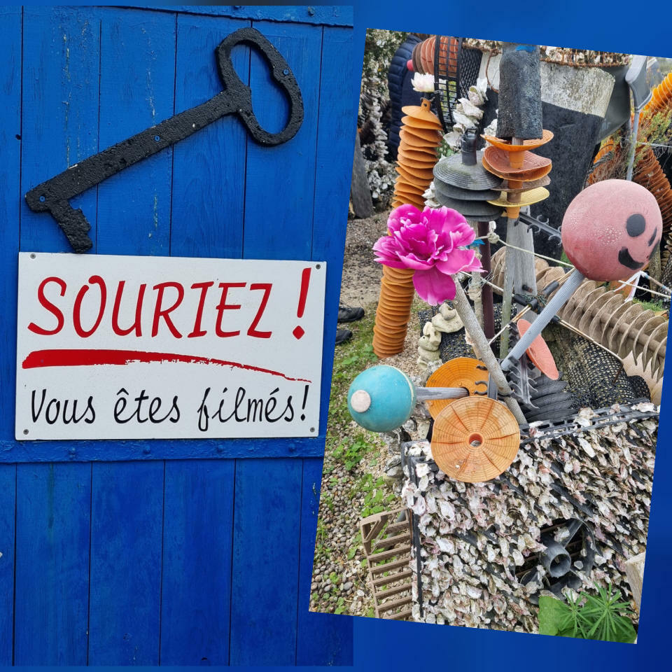 Nous entrons chez « Mr Souc » où le matériel ostréicole est transformé en du grand art surprenant du moment qu'il est recyclé, faut le faire ! Nous poursuivons par le chemin Tricard et Baudrier. Au port, nous dégustons les bananes confites d'Anne et le restant des sablés. Poursuite de la marche par la traversée de la D26 avec bonne prudence. C'est elle qui fait l'entrée/sortie de l'île. Nous prenons le chemin de la Mémoire qui longe la mer des Pertuis et le marais d'Oulme. Nous passons sa pointe et celle Blanche pour entrer dans le chemin des Oiseaux qui nous mène dans toute la partie ostréicole touristique et très colorées.