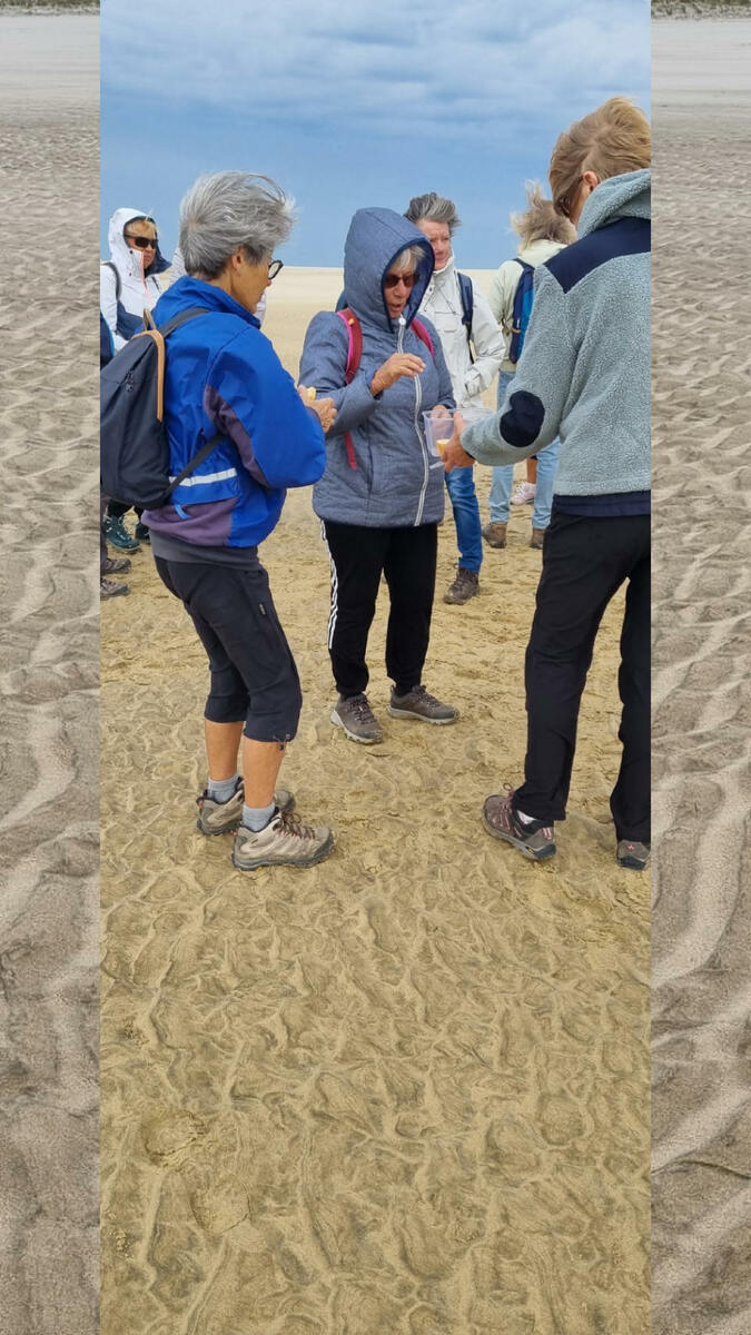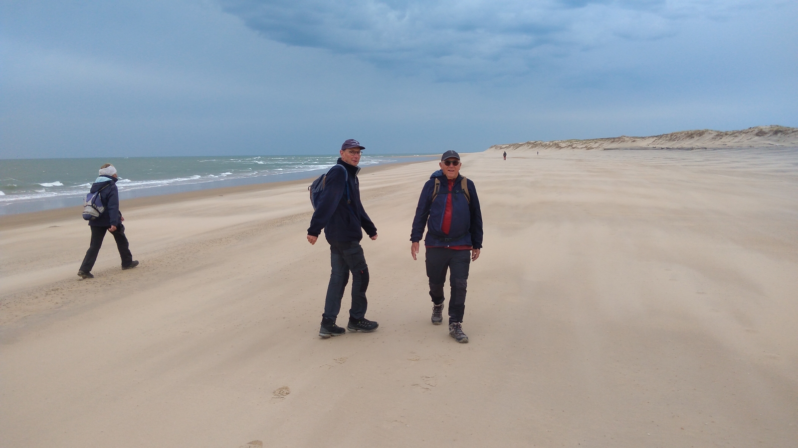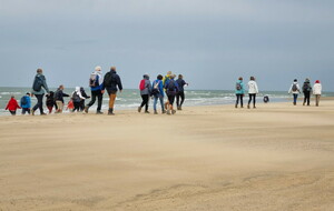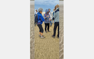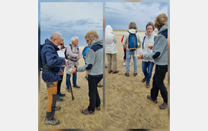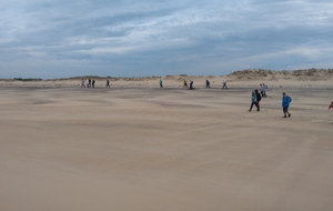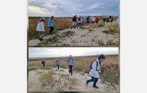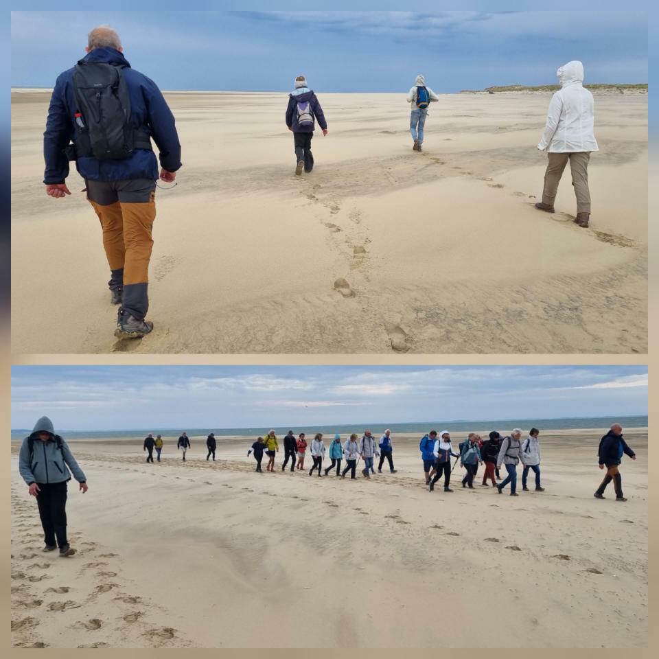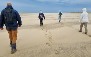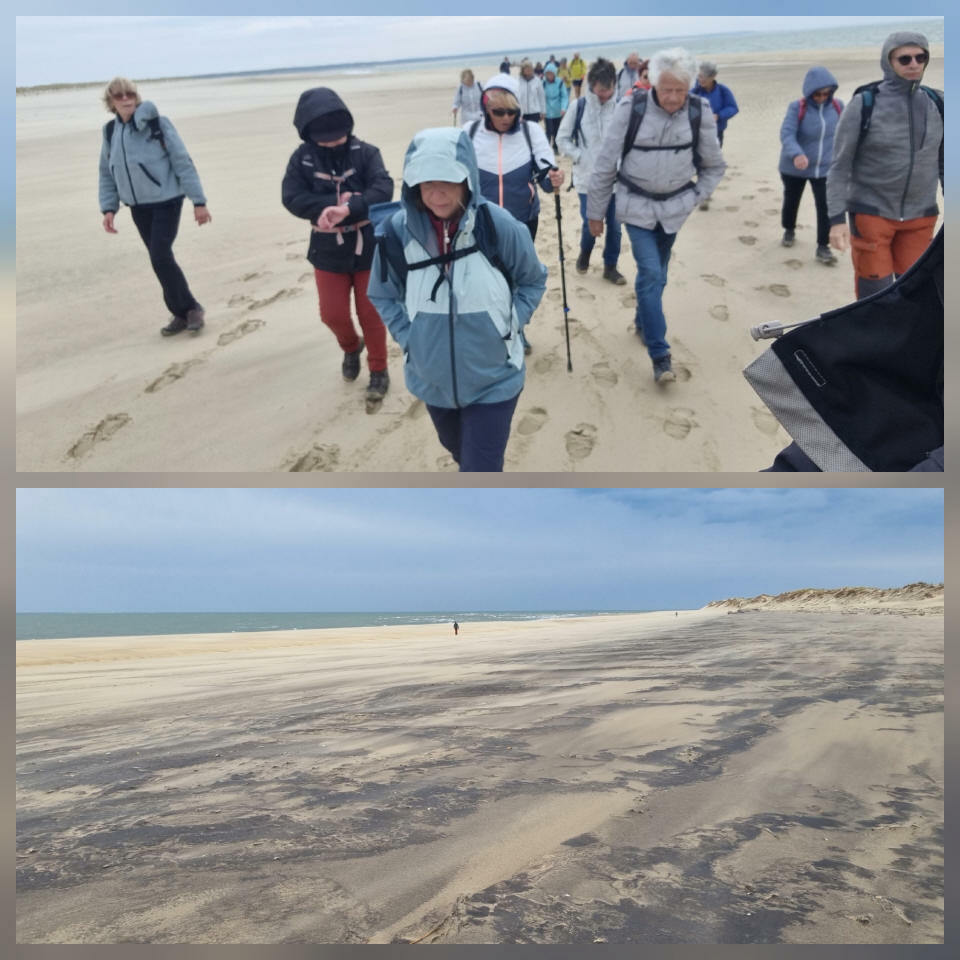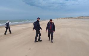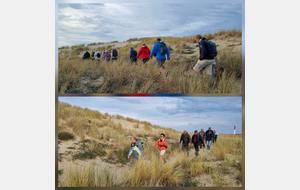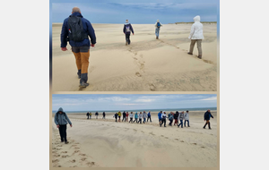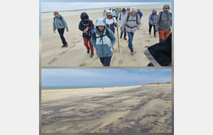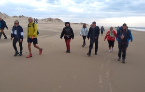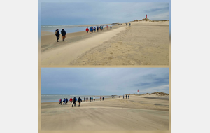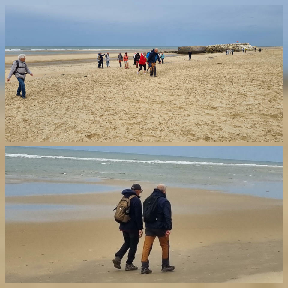 Il est omniprésent, dur, mou, moyen, fin, humide, trempé qu'on s'y enfonce ou pas, il faut l'affronter et de plus, le vent de face rend la marche plus dure. Bonjour les mollets, les cuissous, le cardio, ici il y a tout ce qu'il faut bien pour la santé. En parlant de cela, remerciement à Françoise pour la dégustation de son 4 quart. En fin, la Grande plage qui monte jusqu'à la Pointe Espagnole nous permet de marcher sur une surface tassée par la marée basse. Je reste sur les hauteurs, la marche est très soutenue, le vent fait cingler le sable sur les chaussures. A la hauteur d'un bunker du mur de l'Atlantique qui plonge dans la mer émeraude et l'ancien sémaphore, nous remontons de nouveau une dune au fort dénivelé. Arrivée à destination, nous ovationnons Gérard en l'honneur de tout cet exploit mené bon train dans un parcours difficile très bien orchestré.