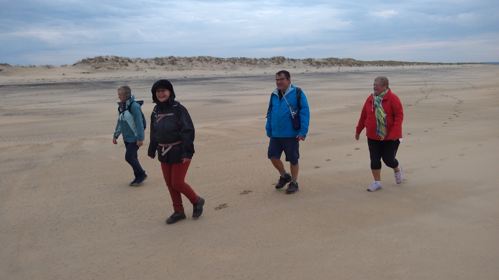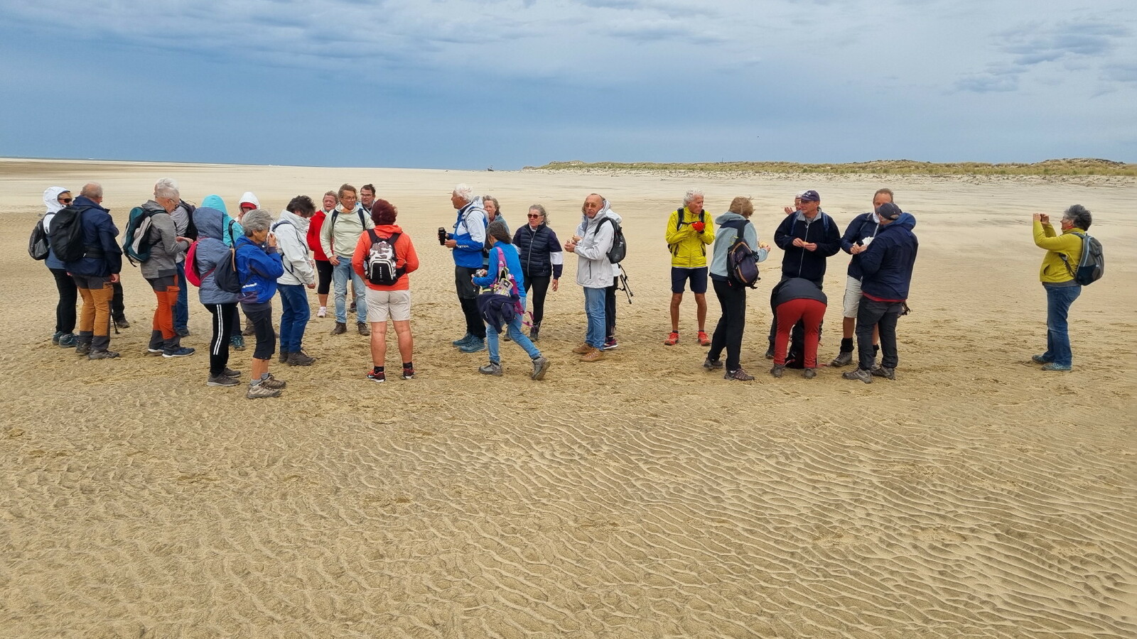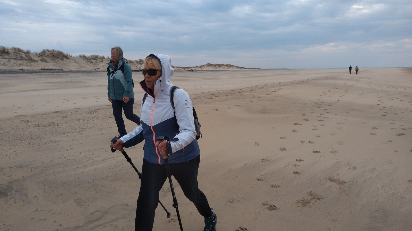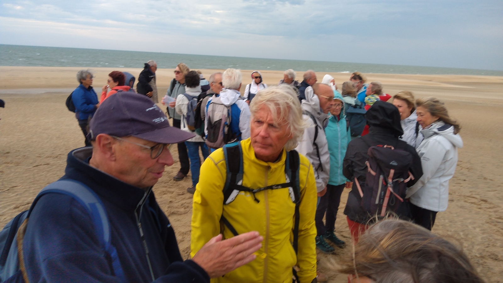 Il est omniprésent, dur, mou, moyen, fin, humide, trempé qu'on s'y enfonce ou pas, il faut l'affronter et de plus, le vent de face rend la marche plus dure. Bonjour les mollets, les cuissous, le cardio, ici il y a tout ce qu'il faut bien pour la santé. En parlant de cela, remerciement à Françoise pour la dégustation de son 4 quart. En fin, la Grande plage qui monte jusqu'à la Pointe Espagnole nous permet de marcher sur une surface tassée par la marée basse. Je reste sur les hauteurs, la marche est très soutenue, le vent fait cingler le sable sur les chaussures. A la hauteur d'un bunker du mur de l'Atlantique qui plonge dans la mer émeraude et l'ancien sémaphore, nous remontons de nouveau une dune au fort dénivelé. Arrivée à destination, nous ovationnons Gérard en l'honneur de tout cet exploit mené bon train dans un parcours difficile très bien orchestré.