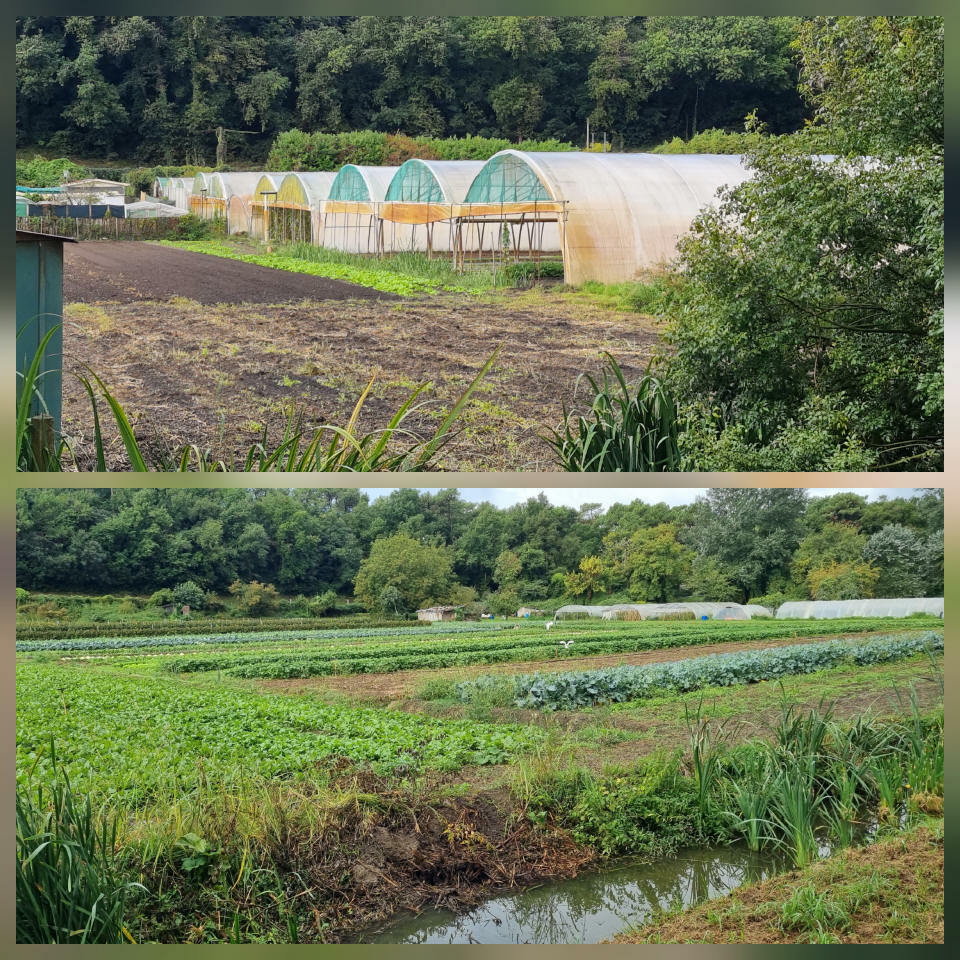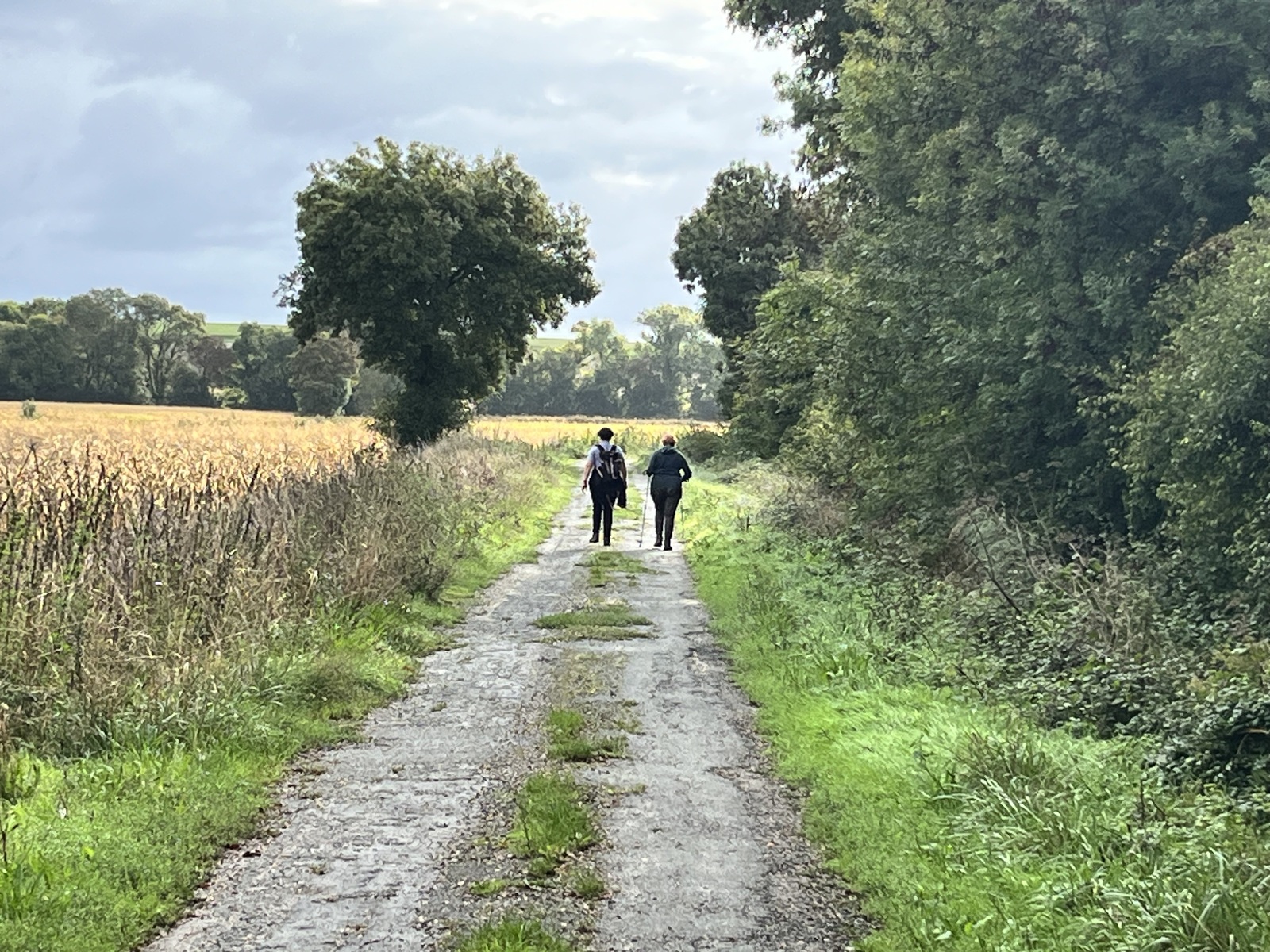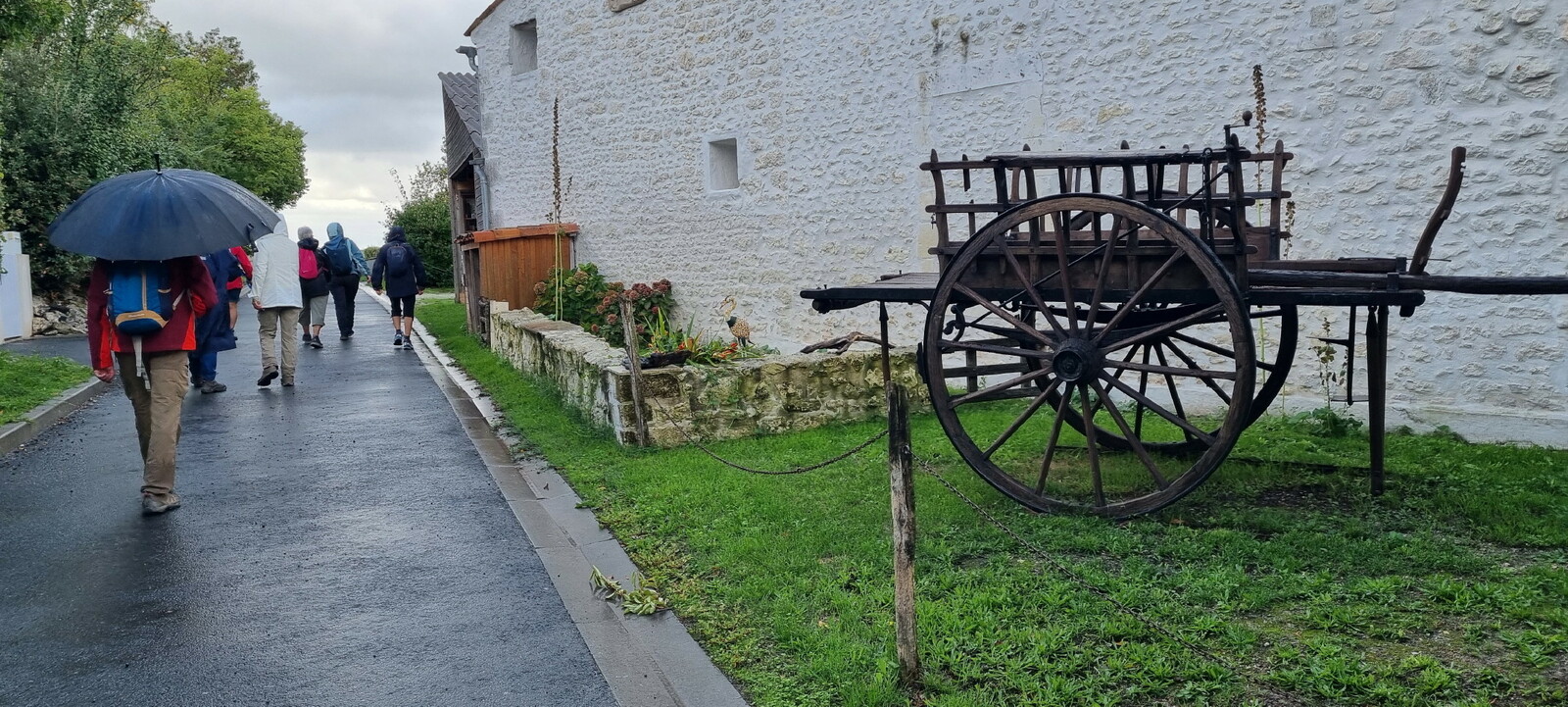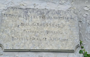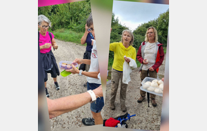 De notre côté, nous poursuivons par le sentier des Passereaux et parvenons au marais de la Briqueterie par le chemin du même nom. Passé les serres de la Chenaunoine et la station d'épuration aux odeurs nauséabondes, nous longeons le Rivaux canal ou quelques moustiques s'invitent à nous picorer. Sous une courte pluie battante on s'engage dans le marais de la Brandelle. Aux portes de Chenaunoine, une pose s'organise et on se régale avec les meringues d'Annie et les carrés cake de Laurence (hum ! Tout est bon). Rue Pasteur du Désert, voir la plaque historique, nous fonçons par le chemin du Terreau traverser la campagne de Chenaunoine avec une belle vue sur les hauteurs de sa région. Sortie du chemin de l'Enclouse au lieu-dit Le Berceau, nous longeons la D145 dans son fossé pour notre sécurité.
