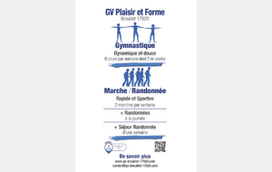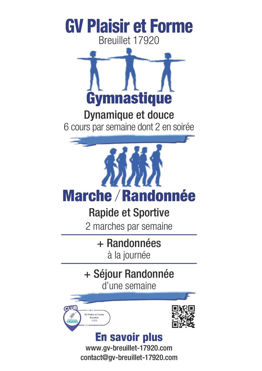 Vous êtes à la recherche d'un club de gymnastique (douce ou dynamique) et/ou de marche active (rapide ou sportive) pour vos activités sportives de la saison 2025/2026, vous êtes à la bonne adresse pour rejoindre une association dynamique et conviviale : GV Plaisir et Forme - Breuillet 17920.